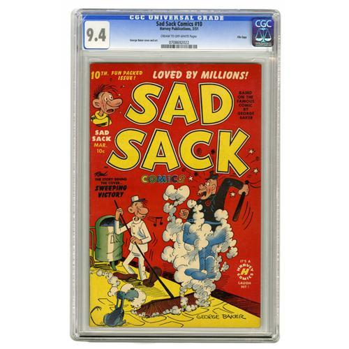 <B>Sad Sack Comics #10 File Copy (Harvey, 1951) CGC NM 9.4 Cream to off-white pages.</B></I> Though we've been privileged to see file copies of this issue before, this is the first 9.4 that has crossed our desks! The issue's cover and art are by the character's creator George Baker. Overstreet 2006 NM- 9.2 value = $160. CGC census 4/06: 3 in 9.4, none higher.