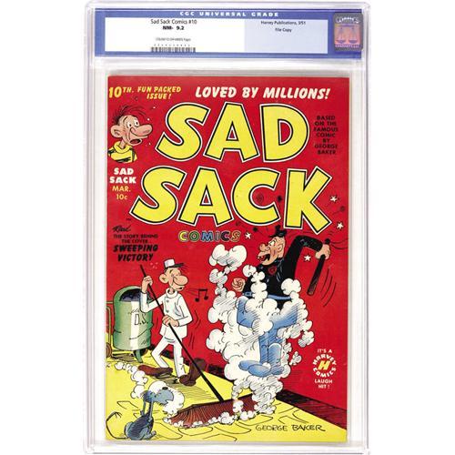 <B>Sad Sack Comics #10 File Copy (Harvey, 1951) CGC NM- 9.2 Cream to off-white pages.</B></I> The issue's cover and art are by the character's creator George Baker. Overstreet 2006 NM- 9.2 value = $160. CGC census 6/06: 4 in 9.2, 3 higher. <BR><BR><B>Important notice:</B> Heritage usually auctions material at the rate of 200-250 lots per hour. On some occasions eBay Live bid software or the Internet may not be able to keep up with the pace of the auction. We recommend placing a realistic absentee bid now as insurance to avoid disappointment. Occasionally the auctioneer may eliminate or reject an eBay Live bid, and the auctioneer may also reopen a lot after the close of the eBay live bidding (usually because we missed an audience bid), and may reject your bid even if it shows you as the winning bidder. By bidding via eBay Live, you agree that Heritage may award the lot to another bidder at its sole discretion under the circumstances described above or any other reasonable circumstances. Since eBay bids are not shown to us until we open the lot on the floor, we treat those bids just like floor bids. In most cases the floor responds before the eBay bid is presented to us, due to Internet lag time, so for consistency we have made it a policy that floor bids are always considered first over tie eBay live bids. Also please note that all Heritage lots purchased through eBay Live carry a 22.5% Buyer's Premium. Please make sure you read the Terms and Conditions before you bid. This lot is being auctioned in conjunction with a live floor auction by Heritage Auction Galleries. All final auction and invoice information will be supplied by Heritage Auction Galleries, and all other information should be considered preliminary. Lot:41001 <BR><BR><B>Winning Notification and Billing:</B> After the FINAL session in this auction is complete, Heritage will send e-mail and snail mail invoices. This process normally takes several days. All final auction and invoice information will be supplied by Heritage Auction Galleries, and all other information should be considered preliminary. <BR><BR>This auction will be conducted on a live auction floor and over the Internet through eBay Live. If you choose to place an absentee bid, please take a moment to <font color='#0000ff'><u><a href='http://pages.ebay.com/liveauctions/help/before/laabsentee.html'>learn how eBay Live absentee bidding works</a></u></font><font color='#000000'>