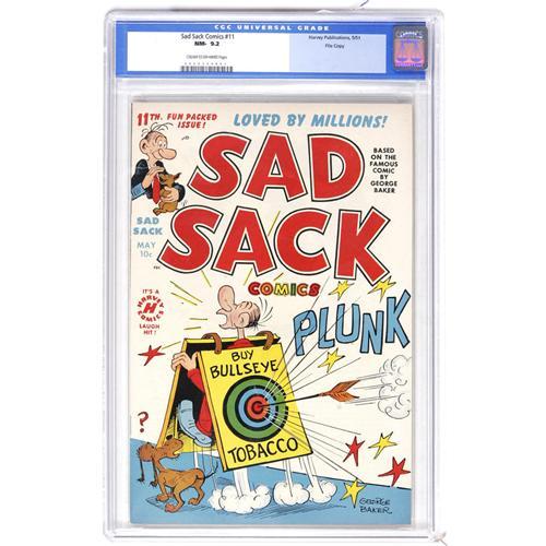 <B>Sad Sack Comics #11 File Copy (Harvey, 1951) CGC NM- 9.2 Cream to off-white pages.</B></I> George Baker cover. Overstreet 2006 NM- 9.2 value = $105. CGC census 6/06: 2 in 9.2, 2 higher. <BR><BR><B>Important notice:</B> Heritage usually auctions material at the rate of 200-250 lots per hour. On some occasions eBay Live bid software or the Internet may not be able to keep up with the pace of the auction. We recommend placing a realistic absentee bid now as insurance to avoid disappointment. Occasionally the auctioneer may eliminate or reject an eBay Live bid, and the auctioneer may also reopen a lot after the close of the eBay live bidding (usually because we missed an audience bid), and may reject your bid even if it shows you as the winning bidder. By bidding via eBay Live, you agree that Heritage may award the lot to another bidder at its sole discretion under the circumstances described above or any other reasonable circumstances. Since eBay bids are not shown to us until we open the lot on the floor, we treat those bids just like floor bids. In most cases the floor responds before the eBay bid is presented to us, due to Internet lag time, so for consistency we have made it a policy that floor bids are always considered first over tie eBay live bids. Also please note that all Heritage lots purchased through eBay Live carry a 22.5% Buyer's Premium. Please make sure you read the Terms and Conditions before you bid. This lot is being auctioned in conjunction with a live floor auction by Heritage Auction Galleries. All final auction and invoice information will be supplied by Heritage Auction Galleries, and all other information should be considered preliminary. Lot:41001 <BR><BR><B>Winning Notification and Billing:</B> After the FINAL session in this auction is complete, Heritage will send e-mail and snail mail invoices. This process normally takes several days. All final auction and invoice information will be supplied by Heritage Auction Galleries, and all other information should be considered preliminary. <BR><BR>This auction will be conducted on a live auction floor and over the Internet through eBay Live. If you choose to place an absentee bid, please take a moment to <font color='#0000ff'><u><a href='http://pages.ebay.com/liveauctions/help/before/laabsentee.html'>learn how eBay Live absentee bidding works</a></u></font><font color='#000000'>