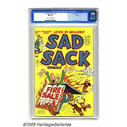 <B>Sad Sack Comics #12 File Copy (Harvey, 1951) CGC NM 9.4 Cream to off-white pages.</B></I> Sad Sack can't get a break, but at least let us brighten up <I>your</B></I> day with this high-grade file copy. The cover is by George Baker. Overstreet 2005 NM- 9.2 value = $100. CGC census 7/05: 3 in 9.4, 1 higher. <BR><BR><B>Important notice:</B> Heritage usually auctions material at the rate of 200-250 lots per hour. On some occasions eBay Live bid software or the Internet may not be able to keep up with the pace of the auction. We recommend placing a realistic absentee bid now as insurance to avoid disappointment. Occasionally the auctioneer may eliminate or reject an eBay Live bid, and the auctioneer may also reopen a lot after the close of the eBay live bidding (usually because we missed an audience bid), and may reject your bid even if it shows you as the winning bidder. By bidding via eBay Live, you agree that Heritage may award the lot to another bidder at its sole discretion under the circumstances described above or any other reasonable circumstances. Since eBay bids are not shown to us until we open the lot on the floor, we treat those bids just like floor bids. In most cases the floor responds before the eBay bid is presented to us, due to Internet lag time, so for consistency we have made it a policy that floor bids are always considered first over tie eBay live bids. Also please note that all Heritage lots purchased through eBay Live carry a 20% Buyer's Premium. Please make sure you read the Terms and Conditions before you bid. This lot is being auctioned in conjunction with a live floor auction by Heritage Galleries & Auctioneers. All final auction and invoice information will be supplied by Heritage Galleries & Auctioneers, and all other information should be considered preliminary. Lot:2459 <BR><BR><B>Winning Notification and Billing:</B> After the FINAL session in this auction is complete, Heritage will send e-mail and snail mail invoices. This process no