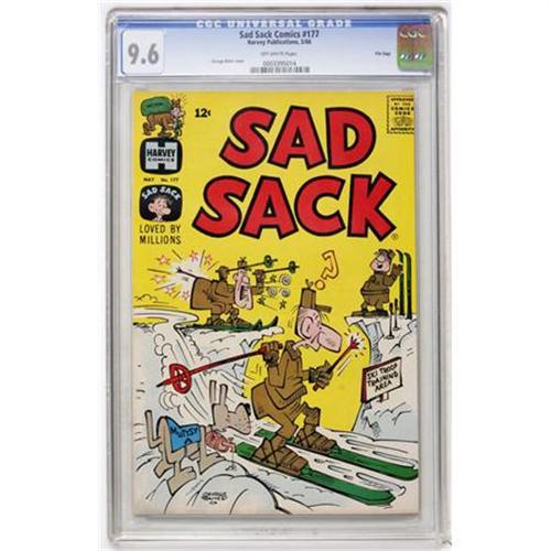 <B>Sad Sack Comics #177 File Copy (Harvey, 1966) CGC NM+ 9.6 Off-white pages.</B></I> George Baker cover. Overstreet 2007 NM- 9.2 value = $16. CGC census 10/07: 1 in 9.6, none higher.<BR><BR><b>Shipping:</b> Comics - Slabbed (certified) (<a target="_blank" href="http://www.heritageauctions.com/common/shipping.php">view shipping information</a>)
