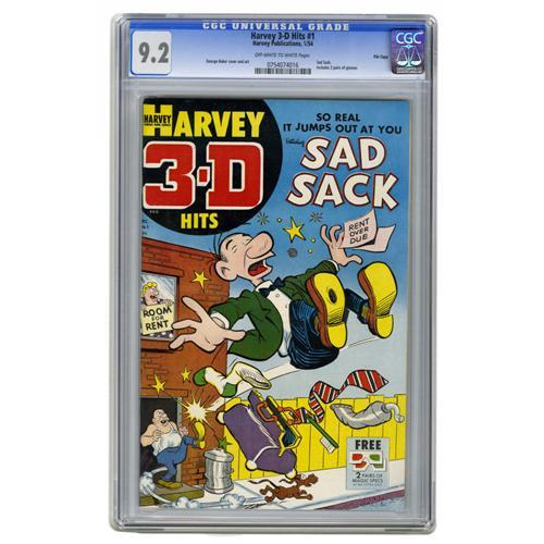 <B>Sad Sack Comics 3-D #1 File Copy (Harvey, 1954) CGC NM- 9.2 Off-white to white pages.</B></I> Also known as <B>Harvey 3-D Hits</B></I> #1, this is a book which you shouldn't expect to find in better condition than this! Given the unpopularity (at the time) of the Sad Sack tales which took place in civilian life rather than the military, as well as the tendency for 3-D glasses to be missing from the books they came in, a file copy is just about your only chance to find everything nice-looking and intact. This one really fills the bill! Overstreet 2006 NM- 9.2 value = $260. CGC census 2/06: 1 in 9.2, none higher.