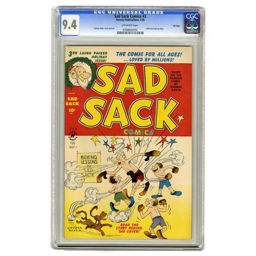 <B>Sad Sack Comics #3 File Copy (Harvey, 1950) CGC NM 9.4 Off-white pages.</B></I> This Christmas issue features a Little Dot story in addition to the star, Sad Sack, who's drawn by George Baker. Overstreet 2006 NM- 9.2 value = $225. CGC census 4/06: 4 in 9.4, 2 higher.