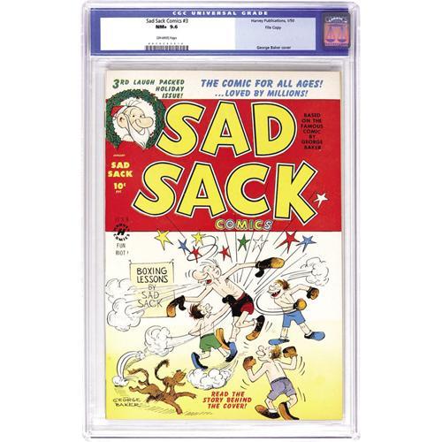 <B>Sad Sack Comics #3 File Copy (Harvey, 1950) CGC NM+ 9.6 Off-white pages.</B></I> This Christmas issue features a Little Dot story in addition to the star, Sad Sack, who's drawn by George Baker. Overstreet 2006 NM- 9.2 value = $225. CGC census 6/06: 2 in 9.6, none higher. <BR><BR><B>Important notice:</B> Heritage usually auctions material at the rate of 200-250 lots per hour. On some occasions eBay Live bid software or the Internet may not be able to keep up with the pace of the auction. We recommend placing a realistic absentee bid now as insurance to avoid disappointment. Occasionally the auctioneer may eliminate or reject an eBay Live bid, and the auctioneer may also reopen a lot after the close of the eBay live bidding (usually because we missed an audience bid), and may reject your bid even if it shows you as the winning bidder. By bidding via eBay Live, you agree that Heritage may award the lot to another bidder at its sole discretion under the circumstances described above or any other reasonable circumstances. Since eBay bids are not shown to us until we open the lot on the floor, we treat those bids just like floor bids. In most cases the floor responds before the eBay bid is presented to us, due to Internet lag time, so for consistency we have made it a policy that floor bids are always considered first over tie eBay live bids. Also please note that all Heritage lots purchased through eBay Live carry a 22.5% Buyer's Premium. Please make sure you read the Terms and Conditions before you bid. This lot is being auctioned in conjunction with a live floor auction by Heritage Auction Galleries. All final auction and invoice information will be supplied by Heritage Auction Galleries, and all other information should be considered preliminary. Lot:41001 <BR><BR><B>Winning Notification and Billing:</B> After the FINAL session in this auction is complete, Heritage will send e-mail and snail mail invoices. This process normally takes several days. All final auction and invoice information will be supplied by Heritage Auction Galleries, and all other information should be considered preliminary. <BR><BR>This auction will be conducted on a live auction floor and over the Internet through eBay Live. If you choose to place an absentee bid, please take a moment to <font color='#0000ff'><u><a href='http://pages.ebay.com/liveauctions/help/before/laabsentee.html'>learn how eBay Live absentee bidding works</a></u></font><font color='#000000'>