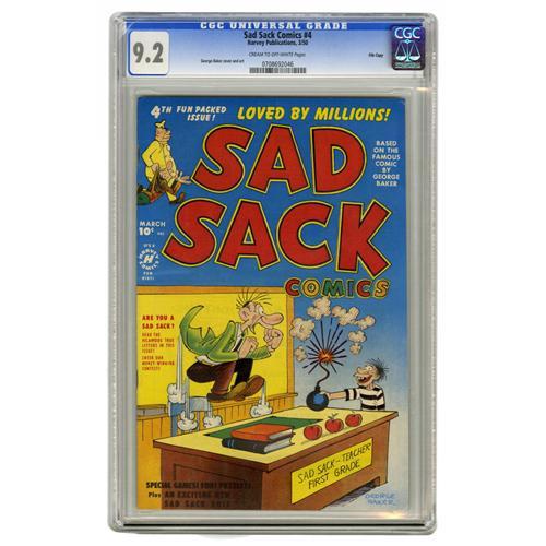 <B>Sad Sack Comics #4 File Copy (Harvey, 1950) CGC NM- 9.2 Cream to off-white pages.</B></I> The reason Sad Sack is trying his luck as a teacher on this cover is that like all of the early issues, this one portrayed the character's return to civilian life. As Overstreet notes, "relatively few of the first 21 issues were ever collected and (they) remain scarce due to this." Overstreet 2006 NM- 9.2 value = $160. CGC census 4/06: 4 in 9.2, 3 higher.