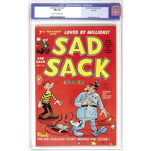 <B>Sad Sack Comics #7 File Copy (Harvey, 1950) CGC NM 9.4 Cream to off-white pages.</B></I> Trying to find early issues of <B>Sad Sack</B></I> in any grade has always been a little tough. In particular, the "civilian" issues prove to be elusive. Here's a great copy, with tons of color and gloss. Overstreet 2006 NM- 9.2 value = $160. CGC census 6/06: 5 in 9.4, 2 higher. <BR><BR><B>Important notice:</B> Heritage usually auctions material at the rate of 200-250 lots per hour. On some occasions eBay Live bid software or the Internet may not be able to keep up with the pace of the auction. We recommend placing a realistic absentee bid now as insurance to avoid disappointment. Occasionally the auctioneer may eliminate or reject an eBay Live bid, and the auctioneer may also reopen a lot after the close of the eBay live bidding (usually because we missed an audience bid), and may reject your bid even if it shows you as the winning bidder. By bidding via eBay Live, you agree that Heritage may award the lot to another bidder at its sole discretion under the circumstances described above or any other reasonable circumstances. Since eBay bids are not shown to us until we open the lot on the floor, we treat those bids just like floor bids. In most cases the floor responds before the eBay bid is presented to us, due to Internet lag time, so for consistency we have made it a policy that floor bids are always considered first over tie eBay live bids. Also please note that all Heritage lots purchased through eBay Live carry a 22.5% Buyer's Premium. Please make sure you read the Terms and Conditions before you bid. This lot is being auctioned in conjunction with a live floor auction by Heritage Auction Galleries. All final auction and invoice information will be supplied by Heritage Auction Galleries, and all other information should be considered preliminary. Lot:41001 <BR><BR><B>Winning Notification and Billing:</B> After the FINAL session in this auction is complete, Heritage will send e-mail and snail mail invoices. This process normally takes several days. All final auction and invoice information will be supplied by Heritage Auction Galleries, and all other information should be considered preliminary. <BR><BR>This auction will be conducted on a live auction floor and over the Internet through eBay Live. If you choose to place an absentee bid, please take a moment to <font color='#0000ff'><u><a href='http://pages.ebay.com/liveauctions/help/before/laabsentee.html'>learn how eBay Live absentee bidding works</a></u></font><font color='#000000'>