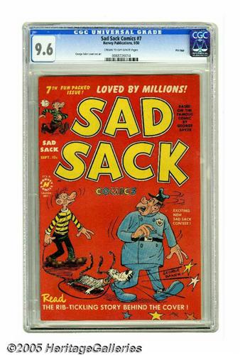 <B>Sad Sack Comics #7 File Copy (Harvey, 1950) CGC NM+ 9.6 Cream to off-white pages.</B></I> If red's your color, you've come to the right lot! This Harvey File Copy is tied for the highest-graded copy of #7 that CGC has certified to date, and it's the reddest cover you're likely to ever see. Overstreet 2005 NM- 9.2 value = $150. CGC census 3/05: 2 in 9.6, none higher.