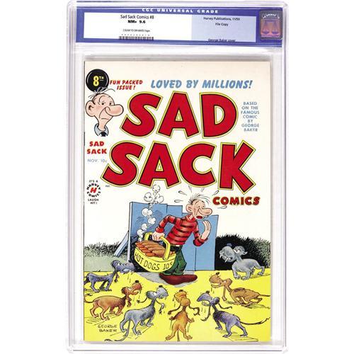 <B>Sad Sack Comics #8 File Copy (Harvey, 1950) CGC NM+ 9.6 Cream to off-white pages.</B></I> There are high-grade comics and then there are high-grade comics! The fact that a book this old, with a white cover no less, survived the ravages of time and still has pages this sharp, is a wonder indeed. Overstreet 2006 NM- 9.2 value = $160. CGC census 6/06: 2 in 9.6, none higher. <BR><BR><B>Important notice:</B> Heritage usually auctions material at the rate of 200-250 lots per hour. On some occasions eBay Live bid software or the Internet may not be able to keep up with the pace of the auction. We recommend placing a realistic absentee bid now as insurance to avoid disappointment. Occasionally the auctioneer may eliminate or reject an eBay Live bid, and the auctioneer may also reopen a lot after the close of the eBay live bidding (usually because we missed an audience bid), and may reject your bid even if it shows you as the winning bidder. By bidding via eBay Live, you agree that Heritage may award the lot to another bidder at its sole discretion under the circumstances described above or any other reasonable circumstances. Since eBay bids are not shown to us until we open the lot on the floor, we treat those bids just like floor bids. In most cases the floor responds before the eBay bid is presented to us, due to Internet lag time, so for consistency we have made it a policy that floor bids are always considered first over tie eBay live bids. Also please note that all Heritage lots purchased through eBay Live carry a 22.5% Buyer's Premium. Please make sure you read the Terms and Conditions before you bid. This lot is being auctioned in conjunction with a live floor auction by Heritage Auction Galleries. All final auction and invoice information will be supplied by Heritage Auction Galleries, and all other information should be considered preliminary. Lot:41001 <BR><BR><B>Winning Notification and Billing:</B> After the FINAL session in this auction is complete, Heritage will send e-mail and snail mail invoices. This process normally takes several days. All final auction and invoice information will be supplied by Heritage Auction Galleries, and all other information should be considered preliminary. <BR><BR>This auction will be conducted on a live auction floor and over the Internet through eBay Live. If you choose to place an absentee bid, please take a moment to <font color='#0000ff'><u><a href='http://pages.ebay.com/liveauctions/help/before/laabsentee.html'>learn how eBay Live absentee bidding works</a></u></font><font color='#000000'>