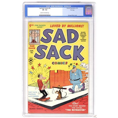 <B>Sad Sack Comics #9 File Copy (Harvey, 1951) CGC VF- 7.5 Cream to off-white pages.</B></I> George Baker cover. Overstreet 2006 VF 8.0 value = $160. CGC census 6/06: 2 in 7.5, 2 higher. <BR><BR><B>Important notice:</B> Heritage usually auctions material at the rate of 200-250 lots per hour. On some occasions eBay Live bid software or the Internet may not be able to keep up with the pace of the auction. We recommend placing a realistic absentee bid now as insurance to avoid disappointment. Occasionally the auctioneer may eliminate or reject an eBay Live bid, and the auctioneer may also reopen a lot after the close of the eBay live bidding (usually because we missed an audience bid), and may reject your bid even if it shows you as the winning bidder. By bidding via eBay Live, you agree that Heritage may award the lot to another bidder at its sole discretion under the circumstances described above or any other reasonable circumstances. Since eBay bids are not shown to us until we open the lot on the floor, we treat those bids just like floor bids. In most cases the floor responds before the eBay bid is presented to us, due to Internet lag time, so for consistency we have made it a policy that floor bids are always considered first over tie eBay live bids. Also please note that all Heritage lots purchased through eBay Live carry a 22.5% Buyer's Premium. Please make sure you read the Terms and Conditions before you bid. This lot is being auctioned in conjunction with a live floor auction by Heritage Auction Galleries. All final auction and invoice information will be supplied by Heritage Auction Galleries, and all other information should be considered preliminary. Lot:41001 <BR><BR><B>Winning Notification and Billing:</B> After the FINAL session in this auction is complete, Heritage will send e-mail and snail mail invoices. This process normally takes several days. All final auction and invoice information will be supplied by Heritage Auction Galleries, and all other information should be considered preliminary. <BR><BR>This auction will be conducted on a live auction floor and over the Internet through eBay Live. If you choose to place an absentee bid, please take a moment to <font color='#0000ff'><u><a href='http://pages.ebay.com/liveauctions/help/before/laabsentee.html'>learn how eBay Live absentee bidding works</a></u></font><font color='#000000'>