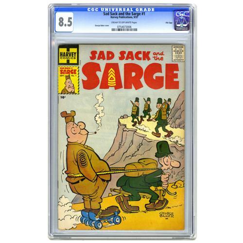 <B>Sad Sack and the Sarge #1 File Copy (Harvey, 1957) CGC VF+ 8.5 Cream to off-white pages.</B></I> George Baker cover. Overstreet 2006 VF 8.0 value = $90; VF/NM 9.0 value = $145. CGC census 2/06: 1 in 8.5, 3 higher.