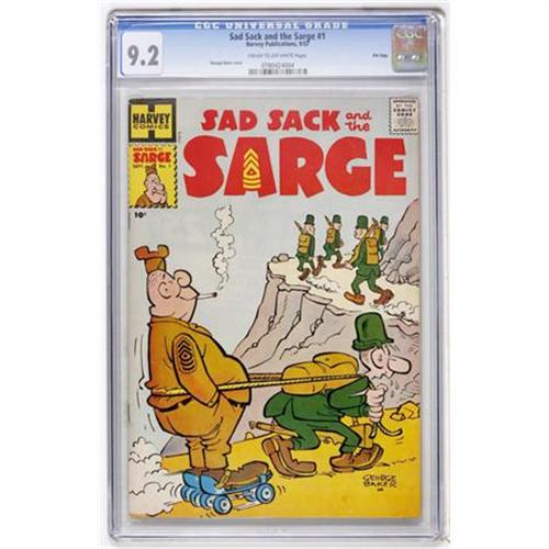 <B>Sad Sack and the Sarge #1 File Copy (Harvey, 1957) CGC NM- 9.2 Cream to off-white pages.</B></I> George Baker cover. Overstreet 2007 NM- 9.2 value = $200. CGC census 12/07: 2 in 9.2, 2 higher.<BR><BR><b>Shipping:</b> Comics - Slabbed (certified) (<a target="_blank" href="http://www.heritageauctions.com/common/shipping.php">view shipping information</a>)