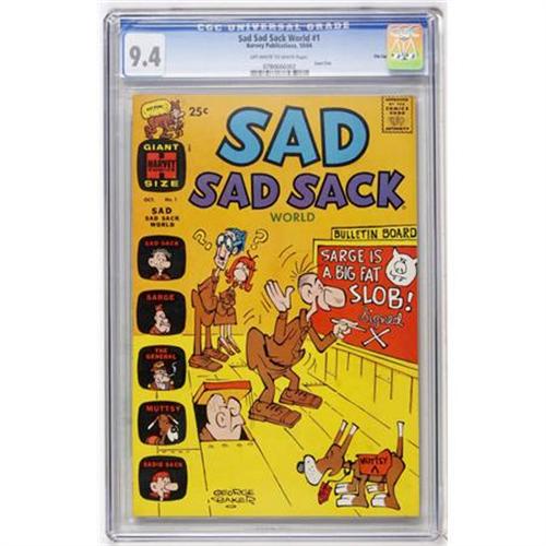 <B>Sad Sad Sack World #1 File Copy (Harvey, 1964) CGC NM 9.4 Off-white to white pages.</B></I> Giant-size issue. Overstreet 2007 NM- 9.2 value = $90. CGC census 1/08: 2 in 9.4, none higher.<BR><BR><b>Shipping:</b> Comics - Slabbed (certified) (<a target="_blank" href="http://www.heritageauctions.com/common/shipping.php">view shipping information</a>)