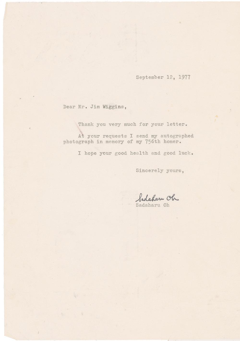Japanese home run champ. TLS, one onionskin page, 7 x 9.75, September 12, 1977. Oh responds to an autograph request. In part: “At your request I send my autographed photograph in memory of my 756th homer. I hope your [sic] good health and good luck.” In fine condition, with scattered light creasing and ding along the right edge.