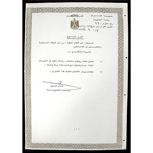 <Our item number 141052><B>Hussein, Saddam.</B> (1937-2006) Dictator of Iraq (1979-2003); overthrown by a U.S.-led invasion; executed by hanging on 30 Dec. 2006. Document signed, on official pale green letterhead with a decorative border, 1p, in Arabic, 12 x 8¼ in. Untranslated. Signed in blue ink. Very fine. <BR>Estimated Value $400 - 600. <BR><BR>Our item number 141052<BR><IMAGES><P ALIGN="CENTER"><IMG SRC="http://www.goldbergcoins.net/liveauction/49jpegs/141052.jpg"> </P></IMAGES>
