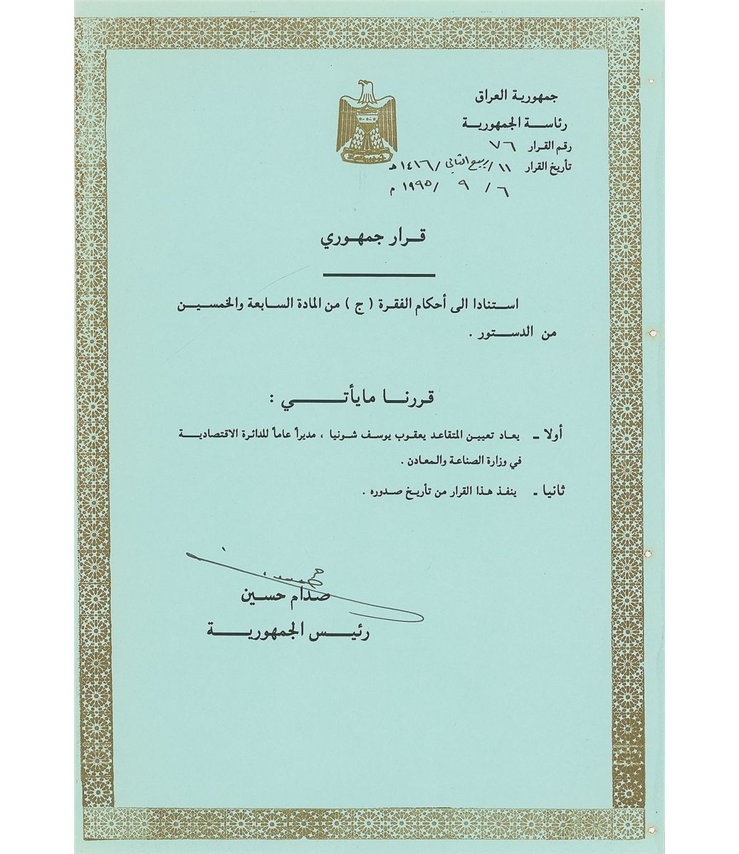 DS, in Arabic, one page, 8.25 x 12, circa 1990s. An untranslated typed document bearing a printed eagle with shield device at the top of the page, signed in black ink at lower left. Small file holes to right margin, otherwise fine, clean condition.