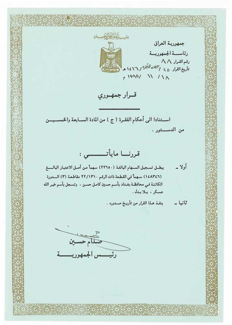 Deposed leader of Iraq. DS, in Arabic, one page, 8.25 x 12, January 1, 1990. An untranslated typed document bearing a printed eagle with shield device at the top of the page, signed in blue ink at lower left. Small file holes to right margin, otherwise fine, clean condition. Pre-certified PSA/DNA and RRAuction COA.