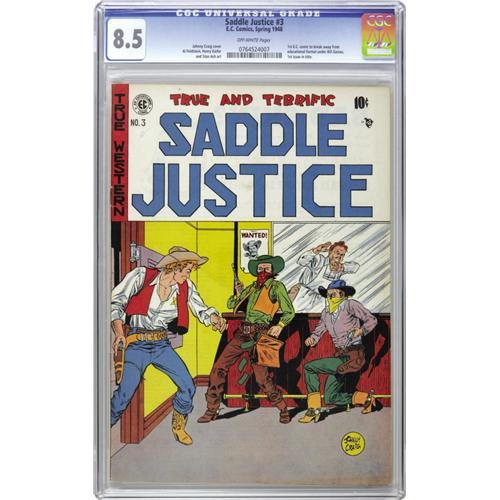 <B>Saddle Justice #3 (EC, 1948) CGC VF+ 8.5 Off-white pages.</B></I> Two milestones are noteworthy here: this is the first EC published by Bill Gaines to break away from the educational format established by his father, M. C. Gaines. It also has the first published EC work of future regular artist (and long-tenured editor of <B>Mad</B></I>) Al Feldstein. The book has a Johnny Craig cover, and other artists include H. C. Kiefer and even Stan ("Johnny Thunder") Aschmeier. This was the first issue of the title, with numbering continued from <B>Happy Houlihans</B></I>. Note that the higher-graded copies in CGC's census are just one notch above this one at 9.0, and note that no Gaines File copies of this book exist. Overstreet 2006 VF 8.0 value = $299; VF/NM 9.0 value = $467. CGC census 10/06: 1 in 8.5, 2 higher.<BR><BR><b>Shipping:</b> Slabbed Comic (<a target="_blank" href="http://www.heritageauctions.com/common/shipping.php">view shipping information</a>)