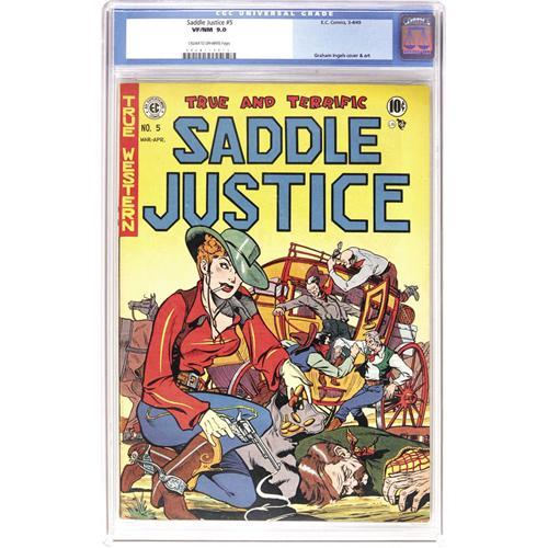 <B>Saddle Justice #5 (EC, 1949) CGC VF/NM 9.0 Cream to off-white pages.</B></I> A Pre-Trend EC in this grade isn't something you see too often! The villainous redhead on the cover is courtesy of artist Graham Ingels. Inside, there's art by Ingels, Johnny Craig, and Al Feldstein. Overstreet 2006 VF/NM 9.0 value = $370; NM- 9.2 value = $500. CGC census 5/06: 1 in 9.0, 1 higher. <BR><BR><B>Important notice:</B> Heritage usually auctions material at the rate of 200-250 lots per hour. On some occasions eBay Live bid software or the Internet may not be able to keep up with the pace of the auction. We recommend placing a realistic absentee bid now as insurance to avoid disappointment. Occasionally the auctioneer may eliminate or reject an eBay Live bid, and the auctioneer may also reopen a lot after the close of the eBay live bidding (usually because we missed an audience bid), and may reject your bid even if it shows you as the winning bidder. By bidding via eBay Live, you agree that Heritage may award the lot to another bidder at its sole discretion under the circumstances described above or any other reasonable circumstances. Since eBay bids are not shown to us until we open the lot on the floor, we treat those bids just like floor bids. In most cases the floor responds before the eBay bid is presented to us, due to Internet lag time, so for consistency we have made it a policy that floor bids are always considered first over tie eBay live bids. Also please note that all Heritage lots purchased through eBay Live carry a 22.5% Buyer's Premium. Please make sure you read the Terms and Conditions before you bid. This lot is being auctioned in conjunction with a live floor auction by Heritage Auction Galleries. All final auction and invoice information will be supplied by Heritage Auction Galleries, and all other information should be considered preliminary. Lot:41001 <BR><BR><B>Winning Notification and Billing:</B> After the FINAL session in this auction is complete, Heritage will send e-mail and snail mail invoices. This process normally takes several days. All final auction and invoice information will be supplied by Heritage Auction Galleries, and all other information should be considered preliminary. <BR><BR>This auction will be conducted on a live auction floor and over the Internet through eBay Live. If you choose to place an absentee bid, please take a moment to <font color='#0000ff'><u><a href='http://pages.ebay.com/liveauctions/help/before/laabsentee.html'>learn how eBay Live absentee bidding works</a></u></font><font color='#000000'>
