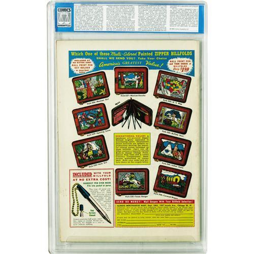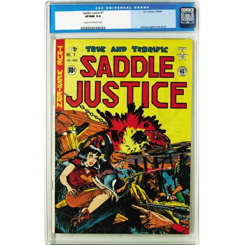 <B>Saddle Justice #7 (EC, 1949) CGC VF/NM 9.0 Cream to off-white pages.</B></I> This copy's tied for the highest grade yet assigned to this pre-Trend book. Graham Ingels showed his surprising "good girl" skills on this issue and the accompanying story. Also contributing art were Al Feldstein and Ed Waldman. Feldstein also drew the public-service ad "Your Newsdealer -- He Is Your Friend" which told teens not to hang around blocking the entrances to newsstands because it scares away paying customers! Hear, hear! Overstreet 2006 VF/NM 9.0 value = $370; NM- 9.2 value = $500. CGC census 3/06: 3 in 9.0, none higher.