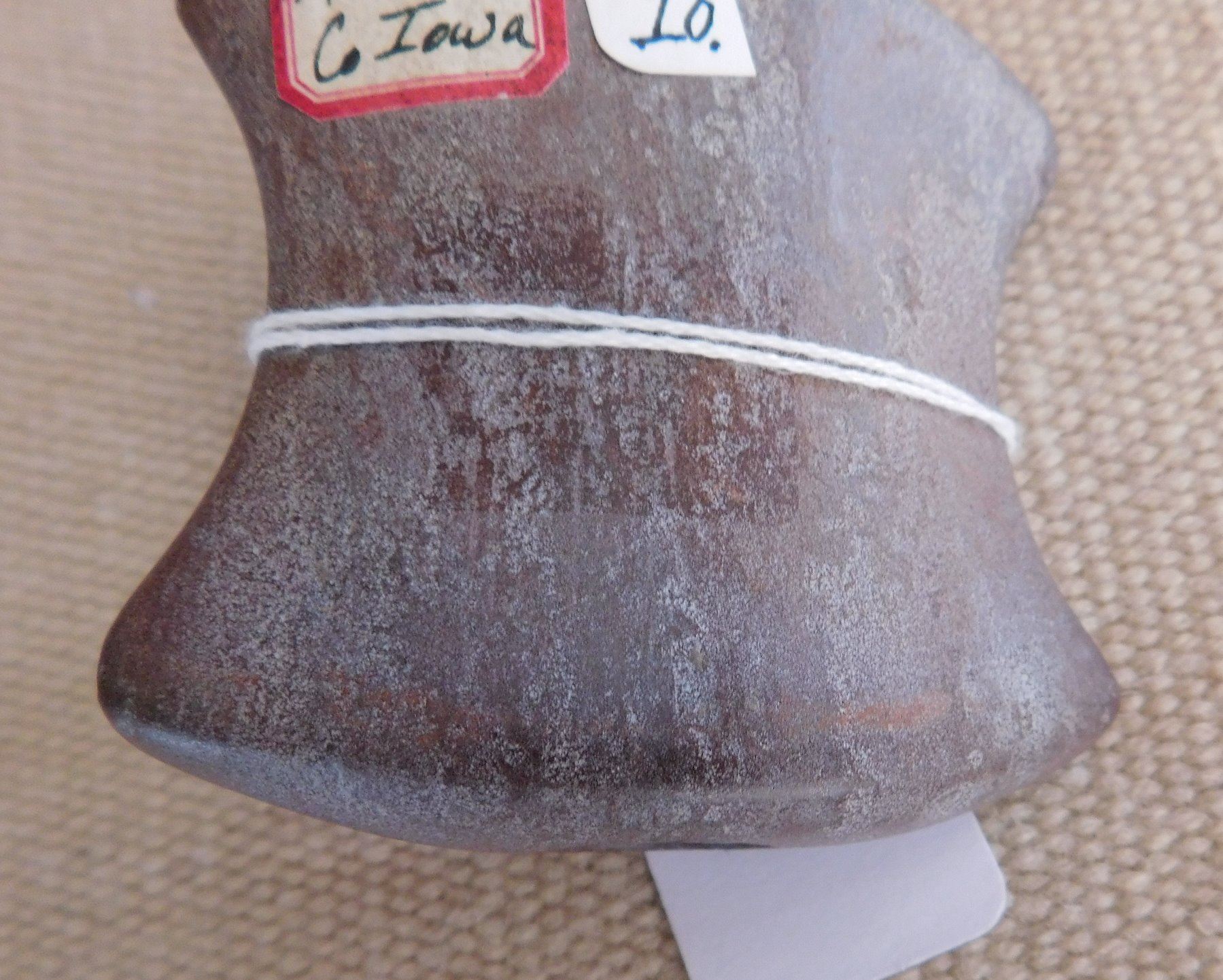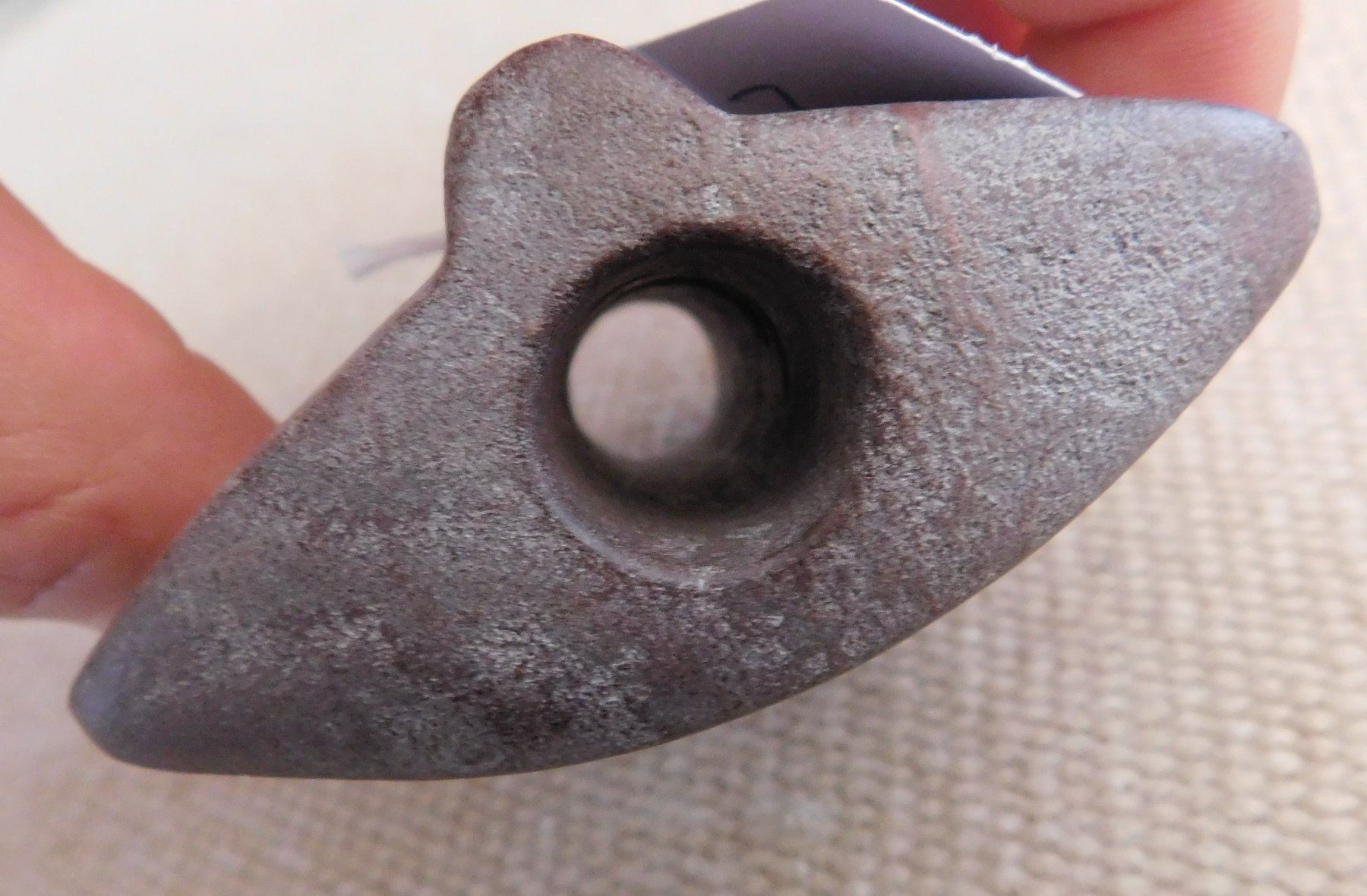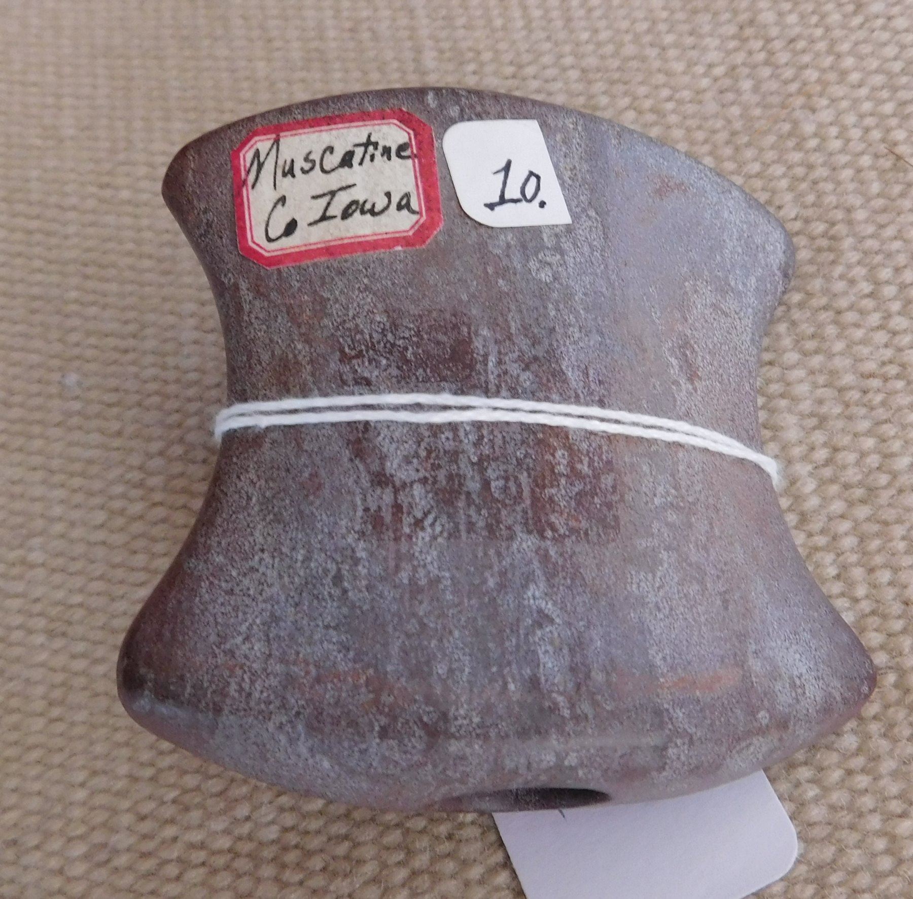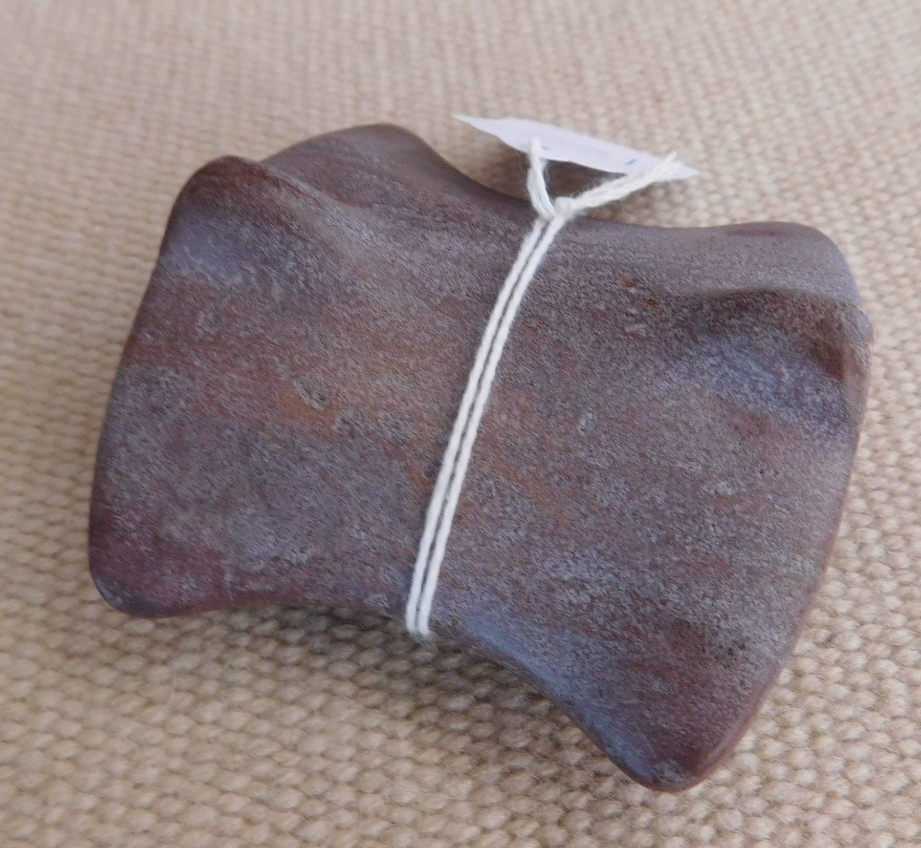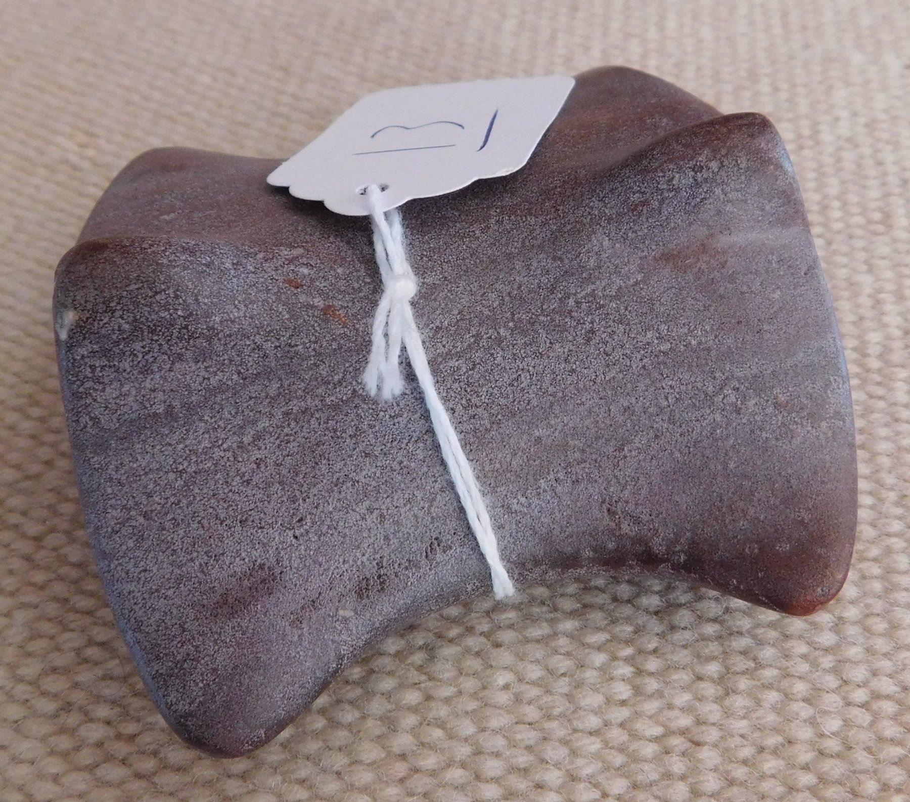 Saddleface Bannerstone, pre-historic item. Made of hardstone, the item measures 3" x 2 3/4". Iowa. Condition: Good, see images. Shipping: $13.50 w/insurance and signature.