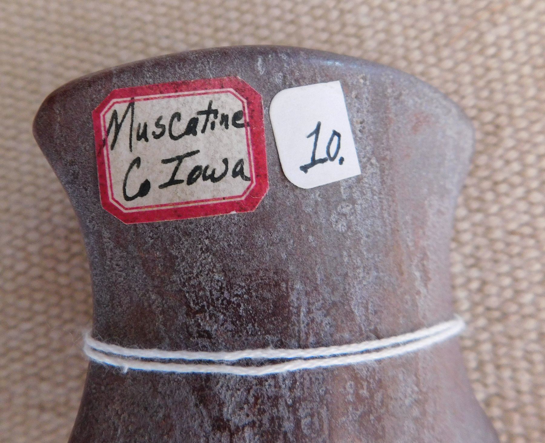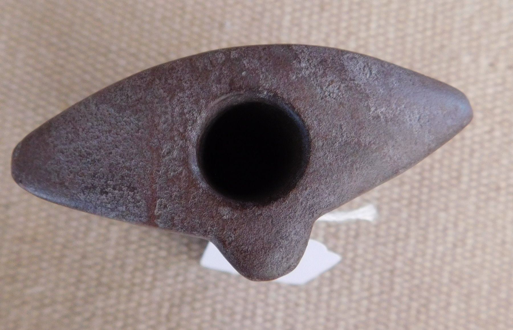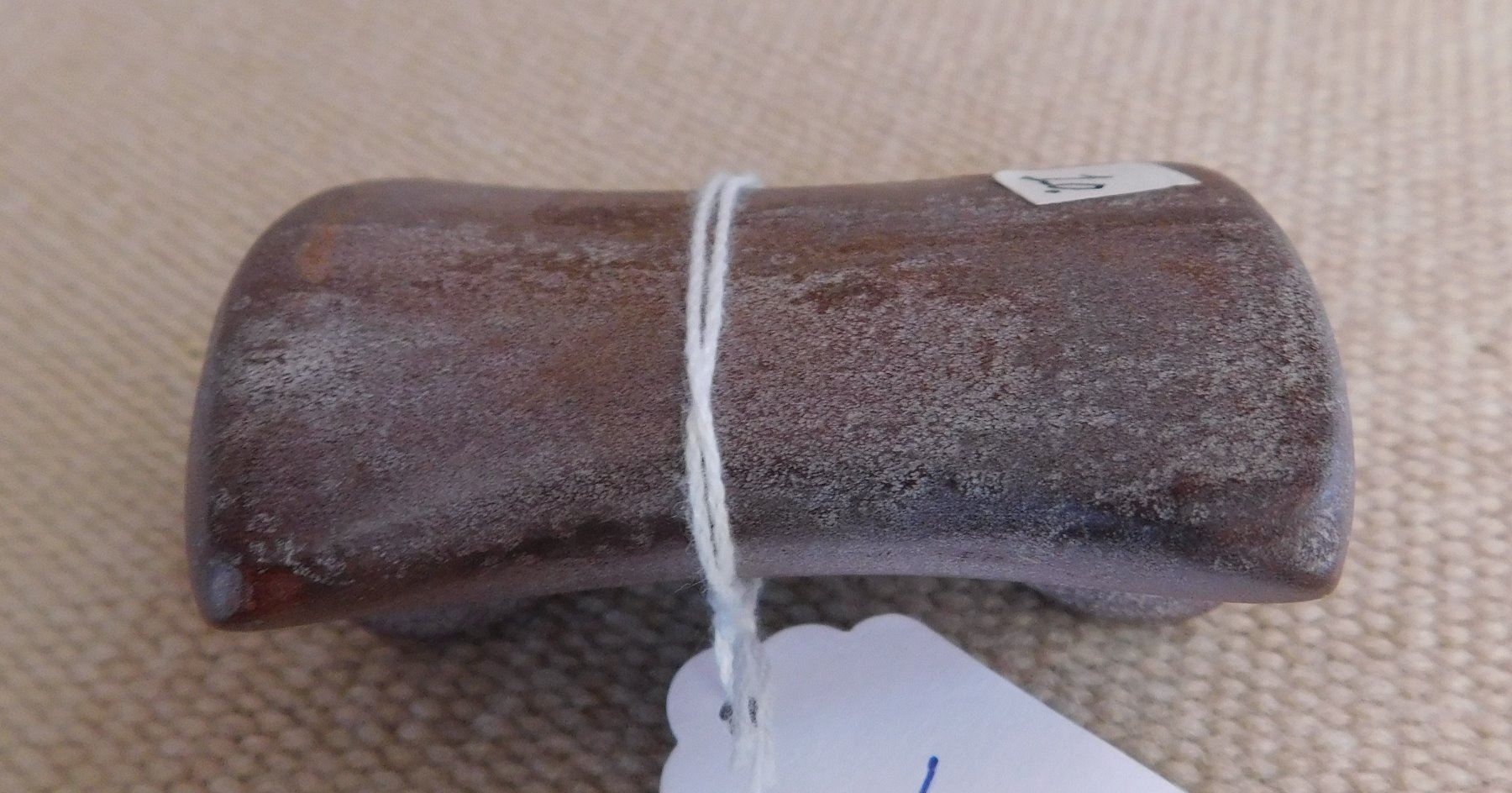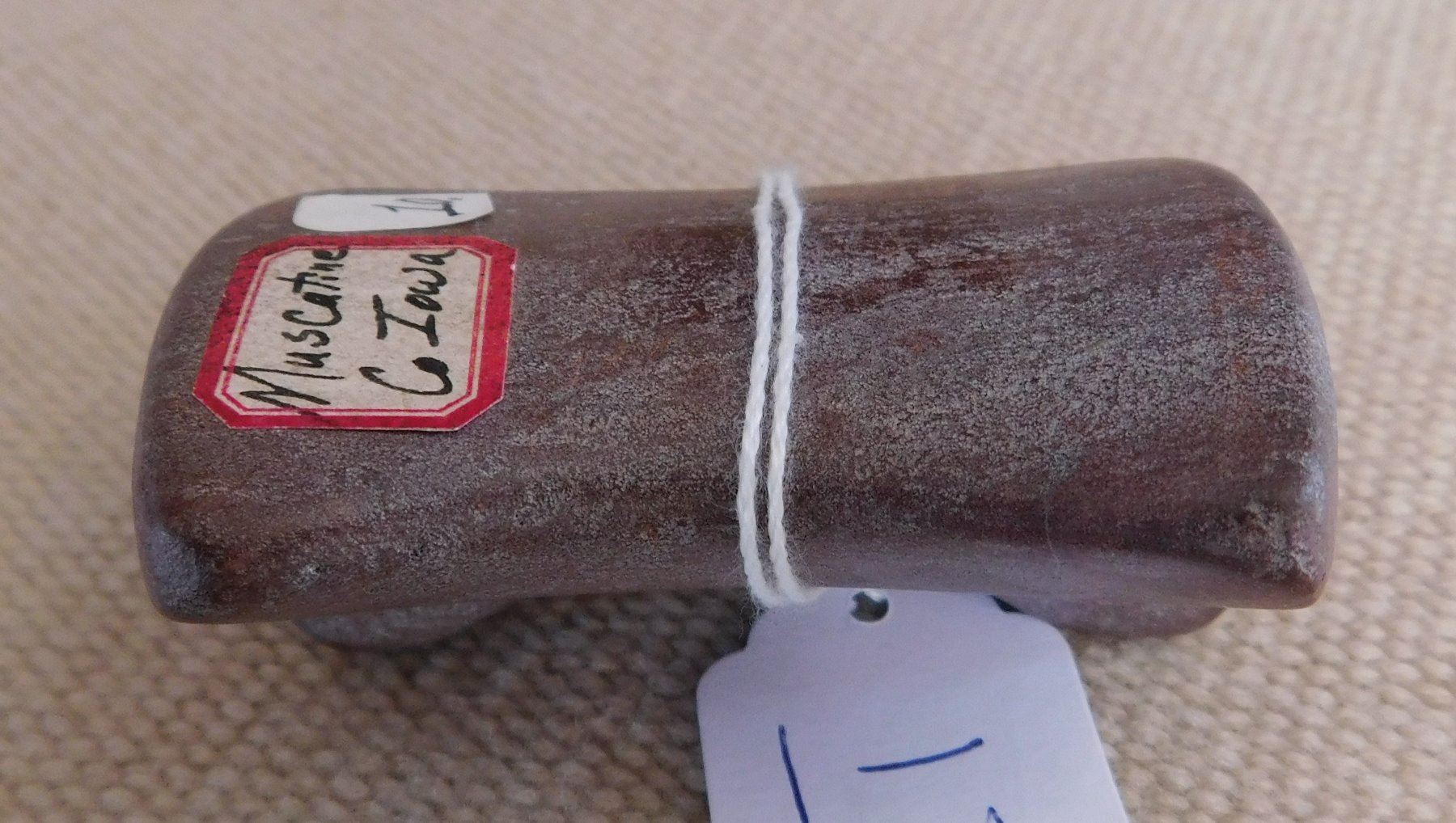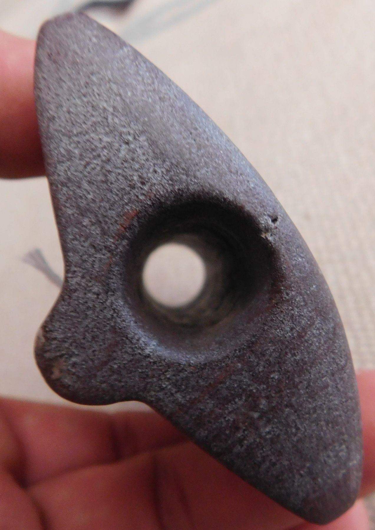Saddleface Bannerstone, pre-historic item. Made of hardstone, the item measures 3" x 2 3/4". Iowa. Condition: Good, see images. Shipping: $13.50 w/insurance and signature.