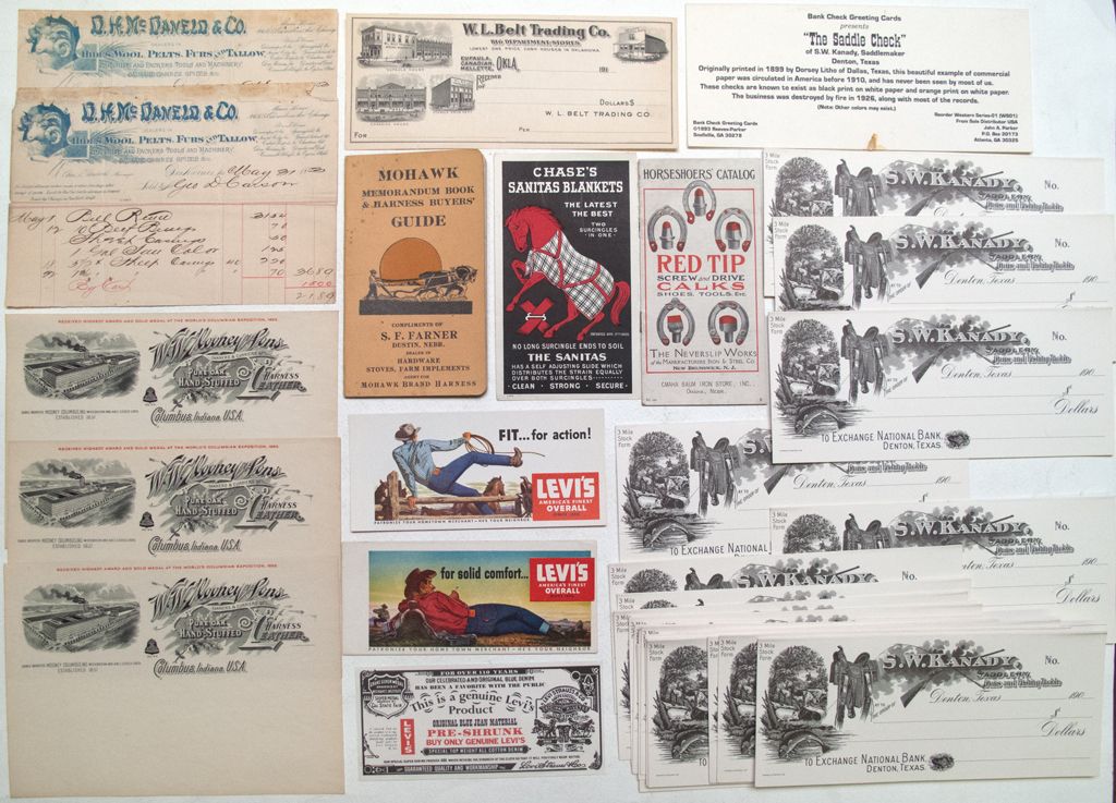 Checks from S W Kanady Saddlery, Levi-Strauss ad piece, Red Tip Horseshoe catalog, Chase's Sanitas Blankets, W L Belt Trading Co. W W Mooney & Sons letter heads, D H McDonald & Co. bill heads.