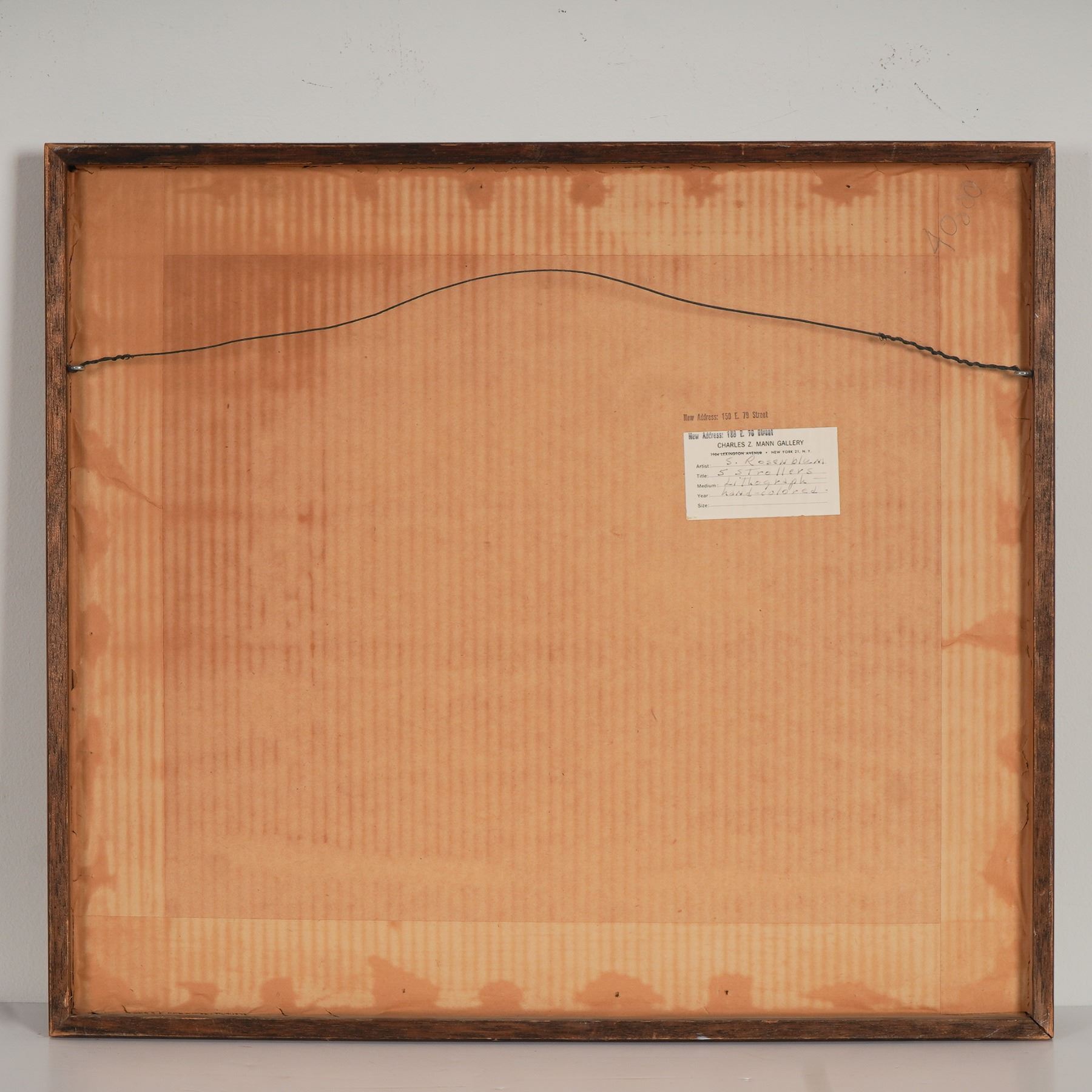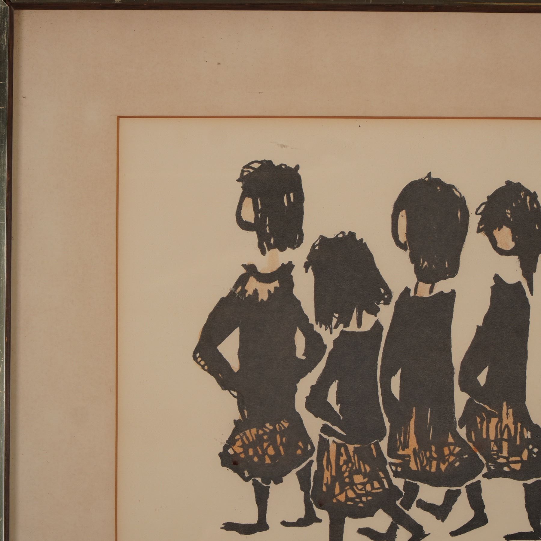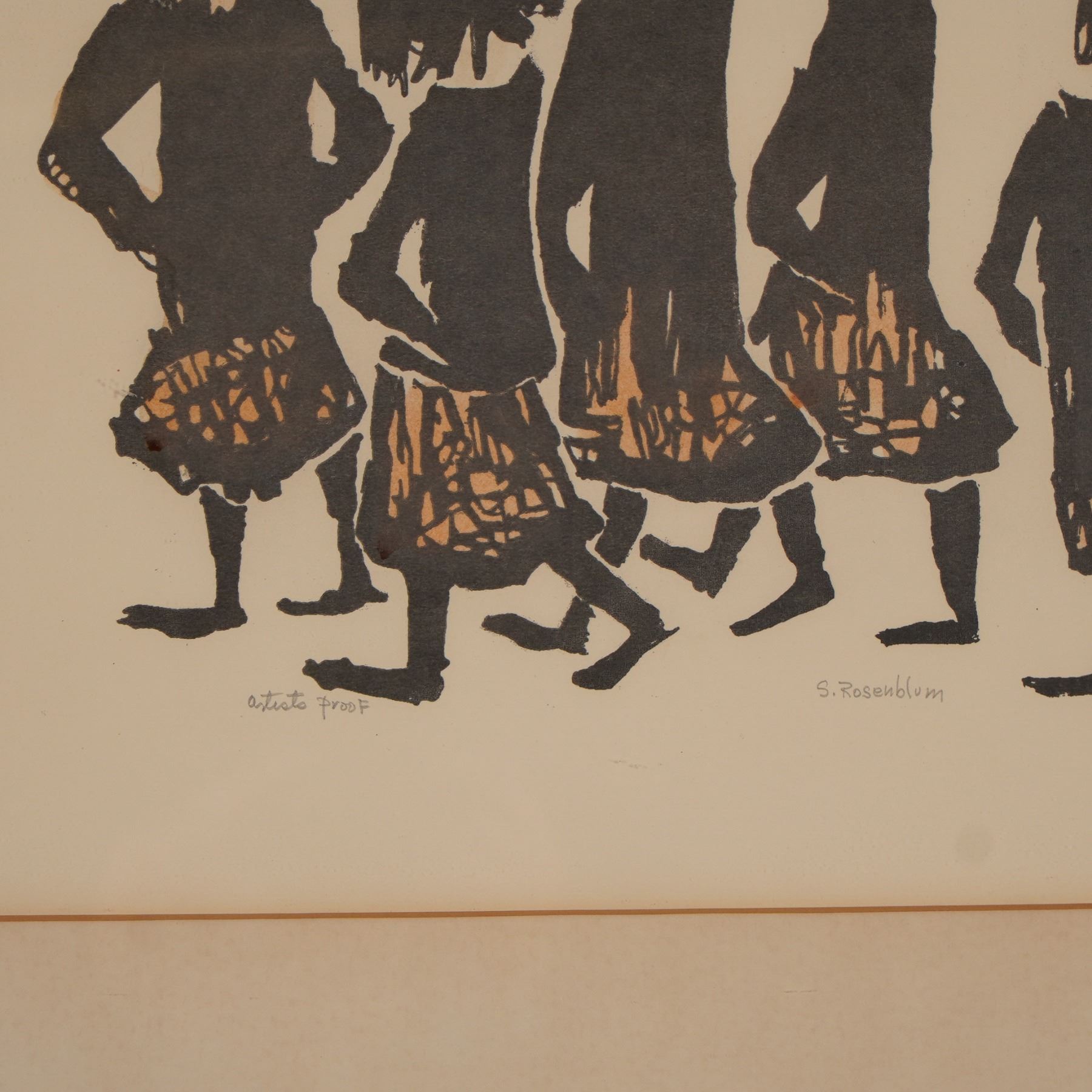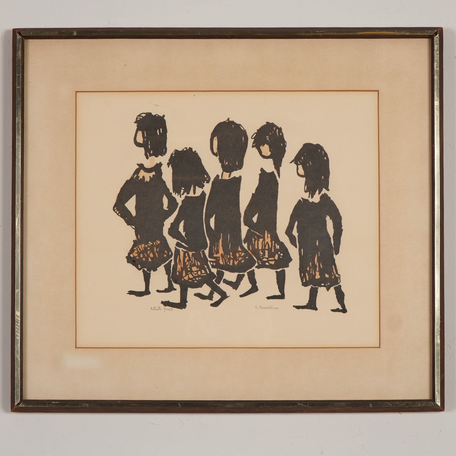 A hand-colored lithograph on paper by artist Sadie Rosenblum titled Five Strollers. This composition features five abstracted figures rendered in expressive black linework, wearing patterned orange skirts. The piece demonstrates Rosenblum's minimalist style, characterized by bold silhouettes and rhythmic composition. Sadie Rosenblum was active during the mid-20th century, known for whimsical and gestural interpretations of everyday figures. Her work is represented in several regional gallery collections. Signed S. Rosenblum lower right and marked Artist Proof lower left. Presented under glass in a vintage metal frame.