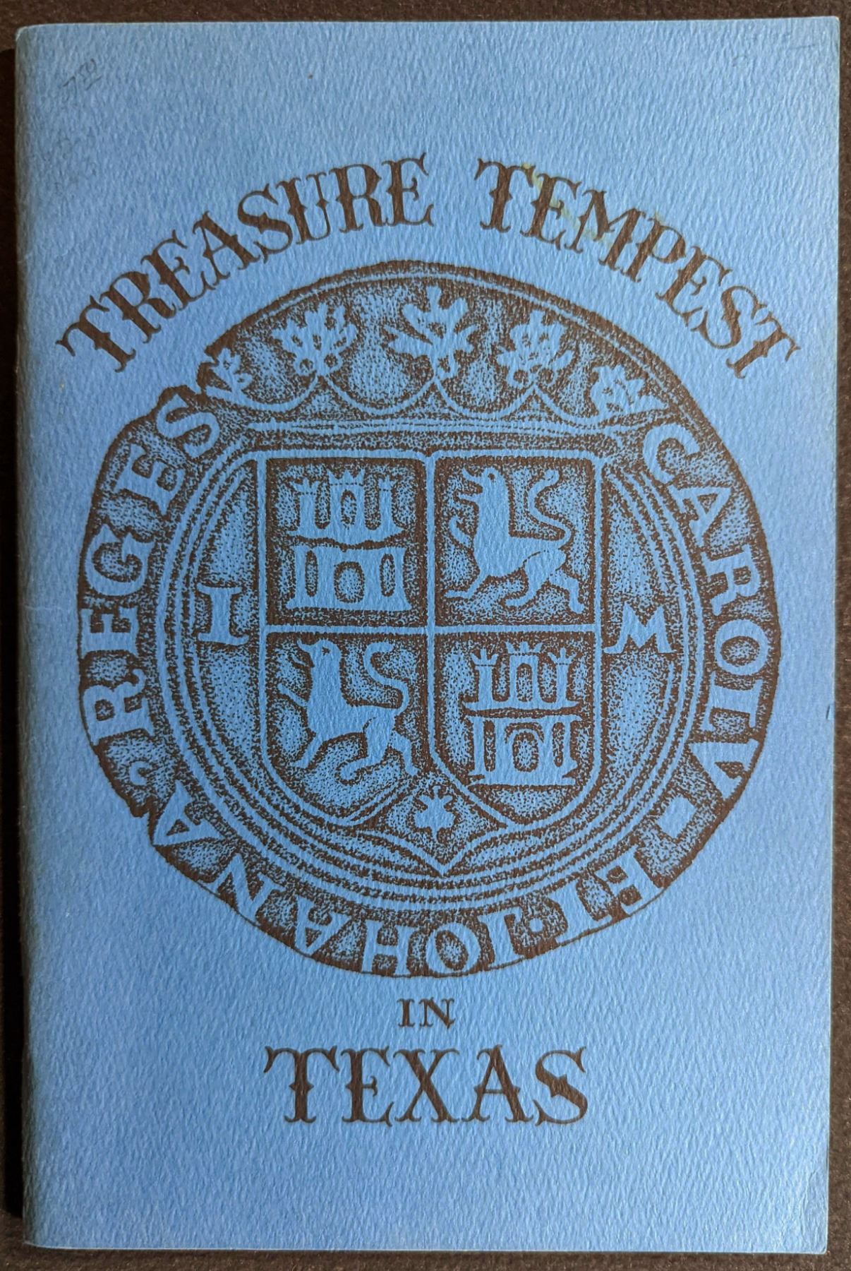 Sadler, Jerry (Ed.). TREASURE TEMPEST IN TEXAS. General Land Office of the State of Texas. 1960s. 12mo. (8), 19, (2) pages. Austin. first edition. original blue printed card covers. illustrations. map. Fine. This book is about the treasure recovered off Padre Island, Texas, in the mid-1960's from a fleet of Spanish ships sunk in 1553. Lot weight: 0 lbs 4oz. Subject(s): Sunken Treasure.