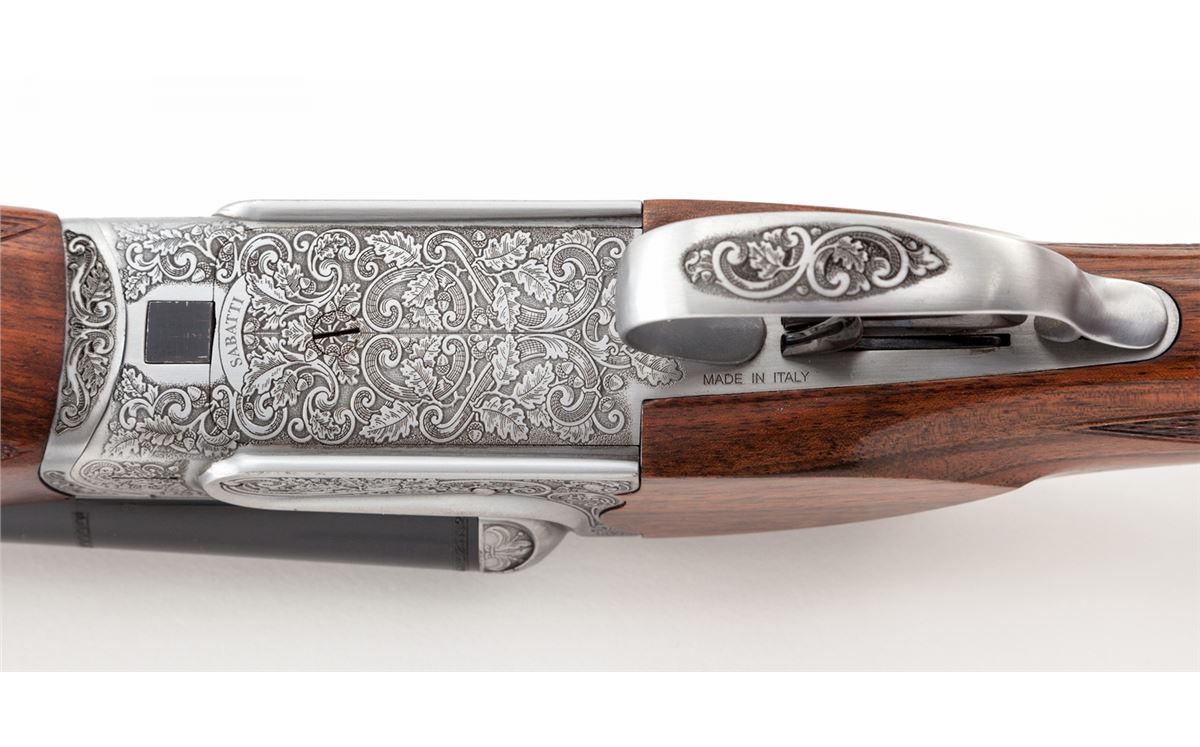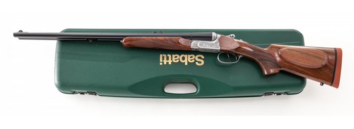 Safari Model Double Rifle, by Sabatti, #CAB0428, .450/400 NE cal., 24'' blue barrels, Italian engraved frame showing oakleaf, scroll and acorn motif; pierced dog-shaped lever, finely checkered walnut stock with cheekpiece, and red Pachmayr Decelerator red rubber butt pad with black spacer. Three-leaf Express rear sight with gold bead front sight. Rear portion of rail drilled and tapped for scope mount, which is included. Condition is excellent showing little use, with very small losses to rear portion of upper edge of forend, which detracts little. Action remains crisp, bores are mirror bright. In original hard case with instructions, snap caps, certificate and test target. Est.: $2,500-$3,500. (Modern)