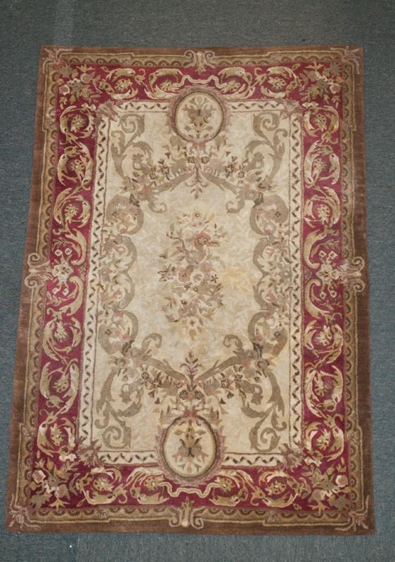 Beige field with scrolling and floral designs with additional colors of red, pink, brown, green and rust. 4' x 6', needs cleaning.