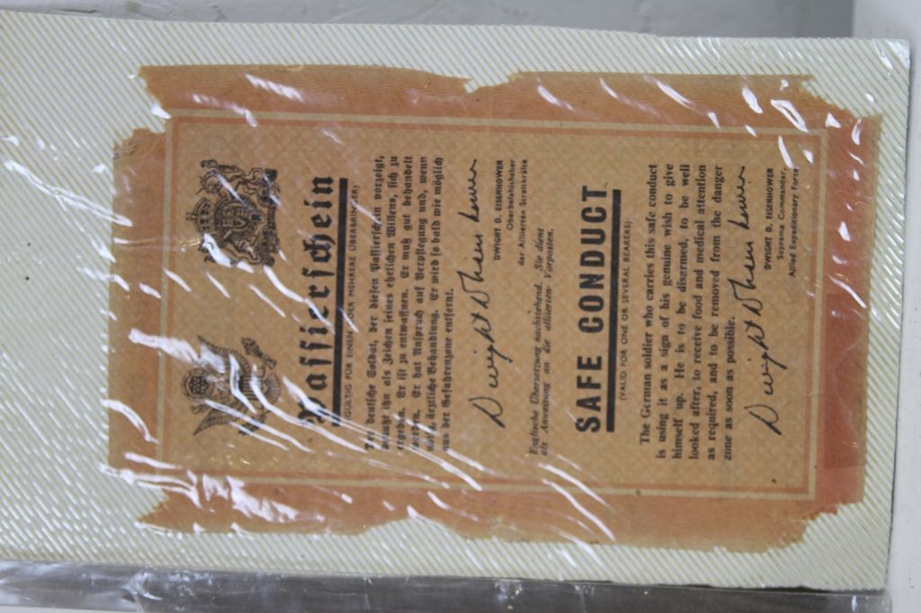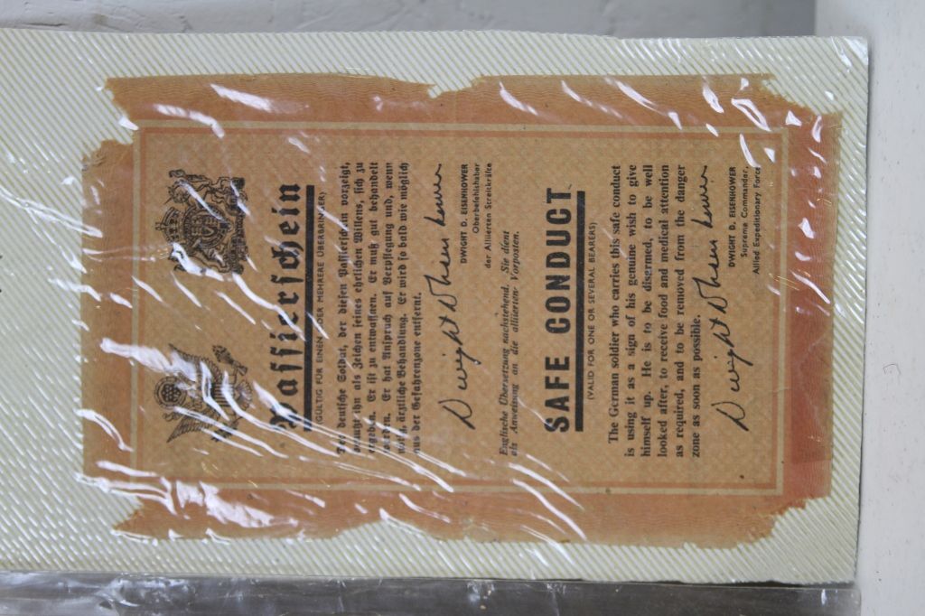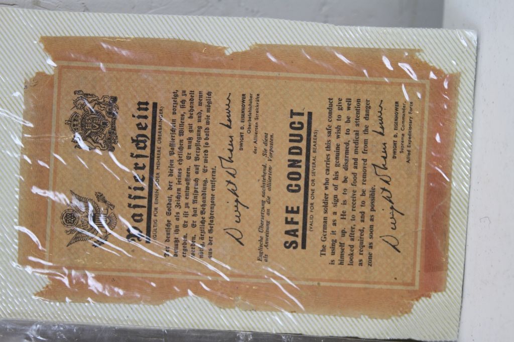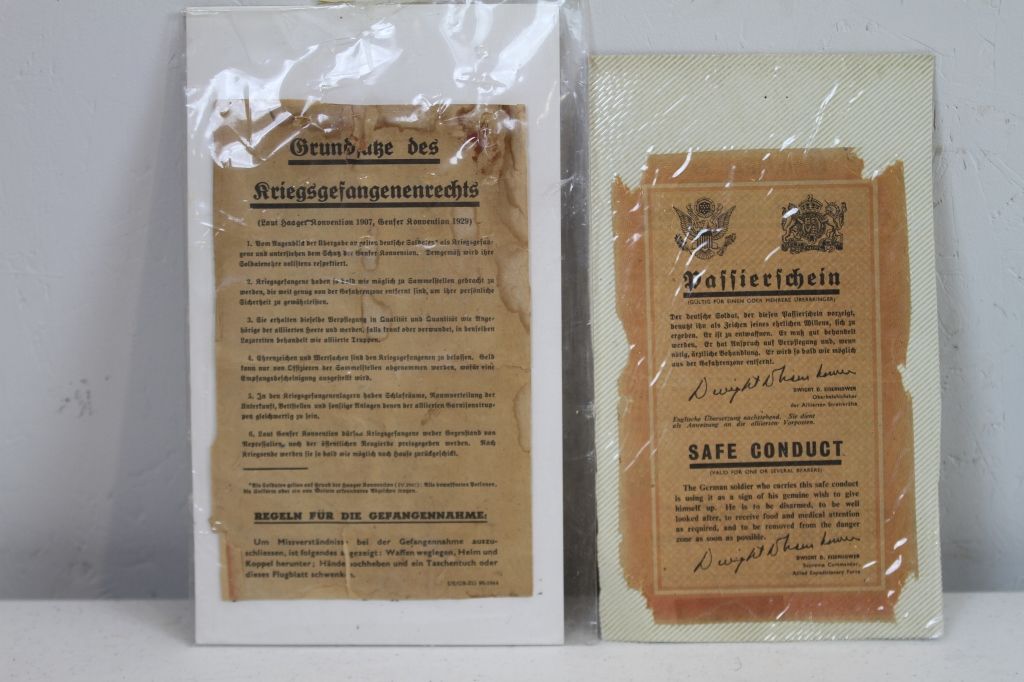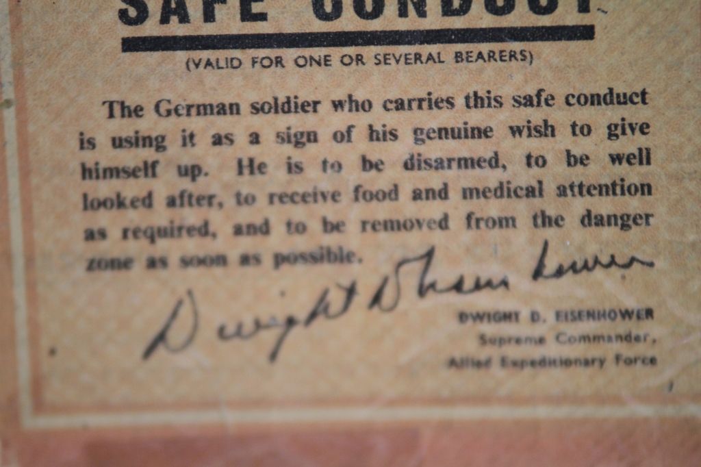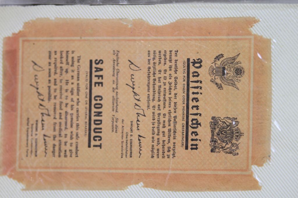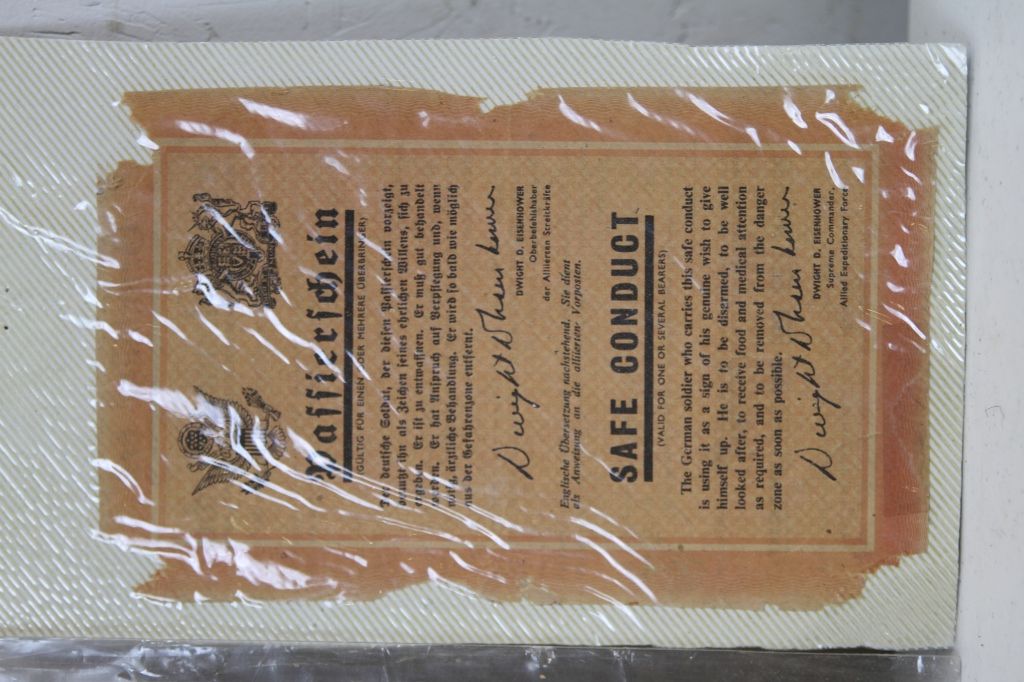 Safe Conduct Pass WWII This was dropped over Germany by the Allies and was a Safe Conduct Pass and would allow a German Soldier to surrender. There two of them in this lot to shop both the front and the back. Printed signature of Dwight D. Eisenhower. Reads, "The German soldier who carries this safe conduct is using it as a sign of his genuine wish to give himself up. He is to be disarmed, to be well looked after, to receive food and medical attention as required, and to be removed from the danger zone as soon as possible." Also in German. These are hard to come by and measure 5"x8".