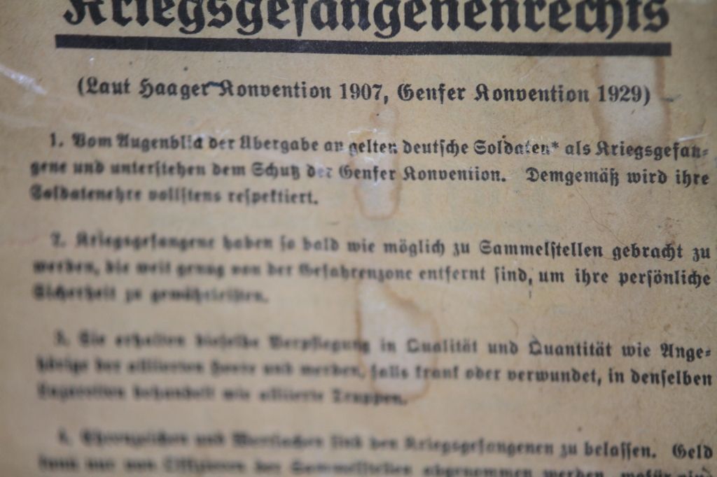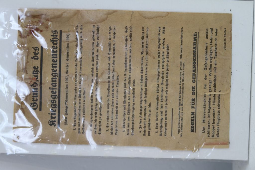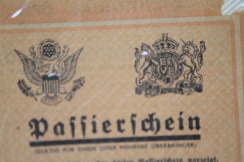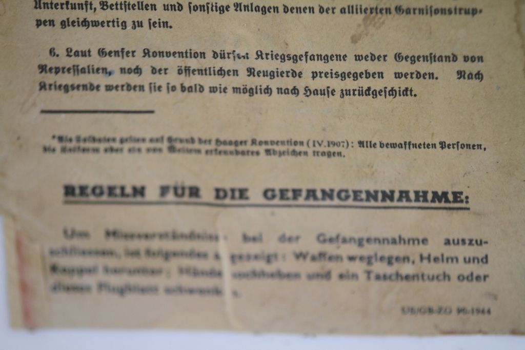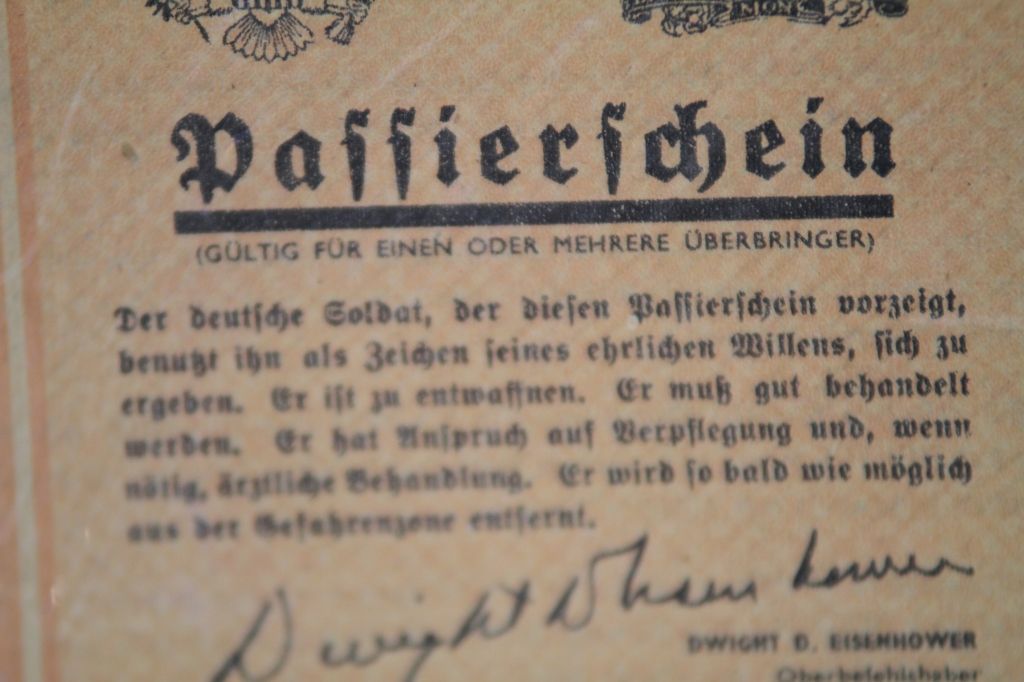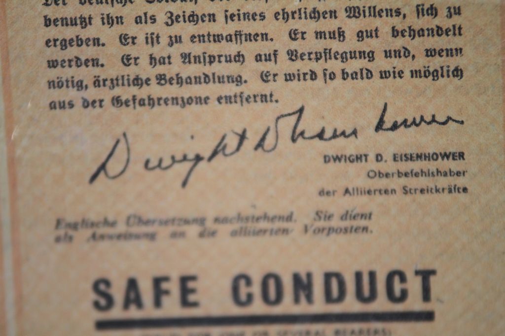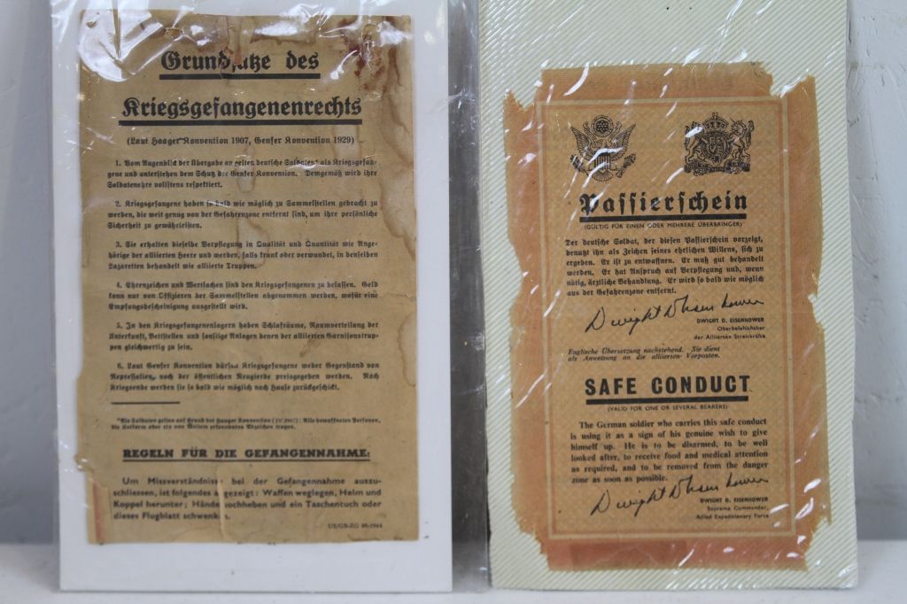 Safe Conduct Pass WWII This was dropped over Germany by the Allies and was a Safe Conduct Pass and would allow a German Soldier to surrender. There two of them in this lot to shop both the front and the back. Printed signature of Dwight D. Eisenhower. Reads, "The German soldier who carries this safe conduct is using it as a sign of his genuine wish to give himself up. He is to be disarmed, to be well looked after, to receive food and medical attention as required, and to be removed from the danger zone as soon as possible." Also in German. These are hard to come by and measure 5"x8".