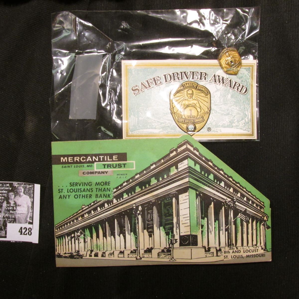 Safe Driver Award Cards and Gold-colored Pin-back; & "Mercantile Trust Company Saint Louis, Mo." Dim