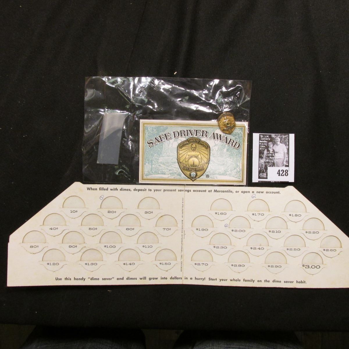 Safe Driver Award Cards and Gold-colored Pin-back; & "Mercantile Trust Company Saint Louis, Mo." Dime Saver advertising folder.