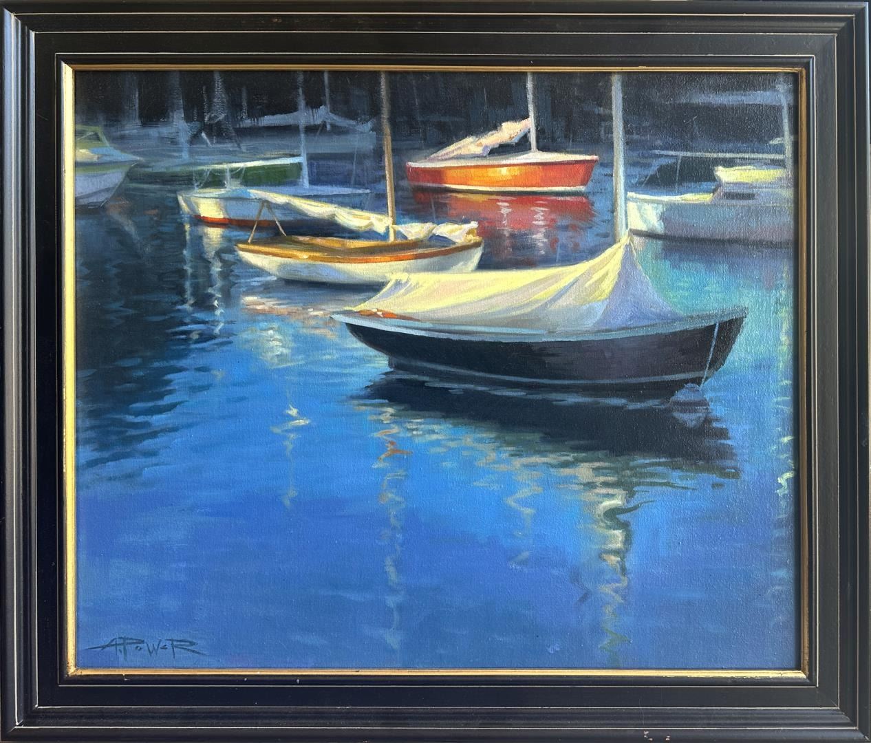 Sailboats at anchor in Harwich Harbor on Cape Cod. This 20x24 oil on canvas panel by Anette Power, is framed at 24x28 , with artist's COA
