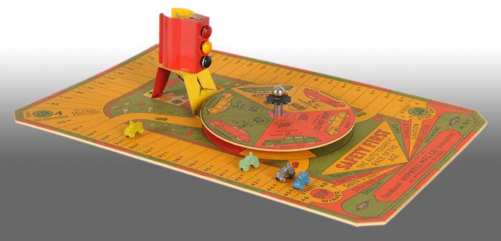 Description Made by Hipwell Manufacturing Company in Pittsburgh, PA. Includes colorful cardboard litho playing board, battery operated spinner, two small pot-metal automobiles with molded drivers, and one steel marble. Includes original box with cardboard insert, some creasing, and tears. Condition (Very Good). Size 12" x 18".