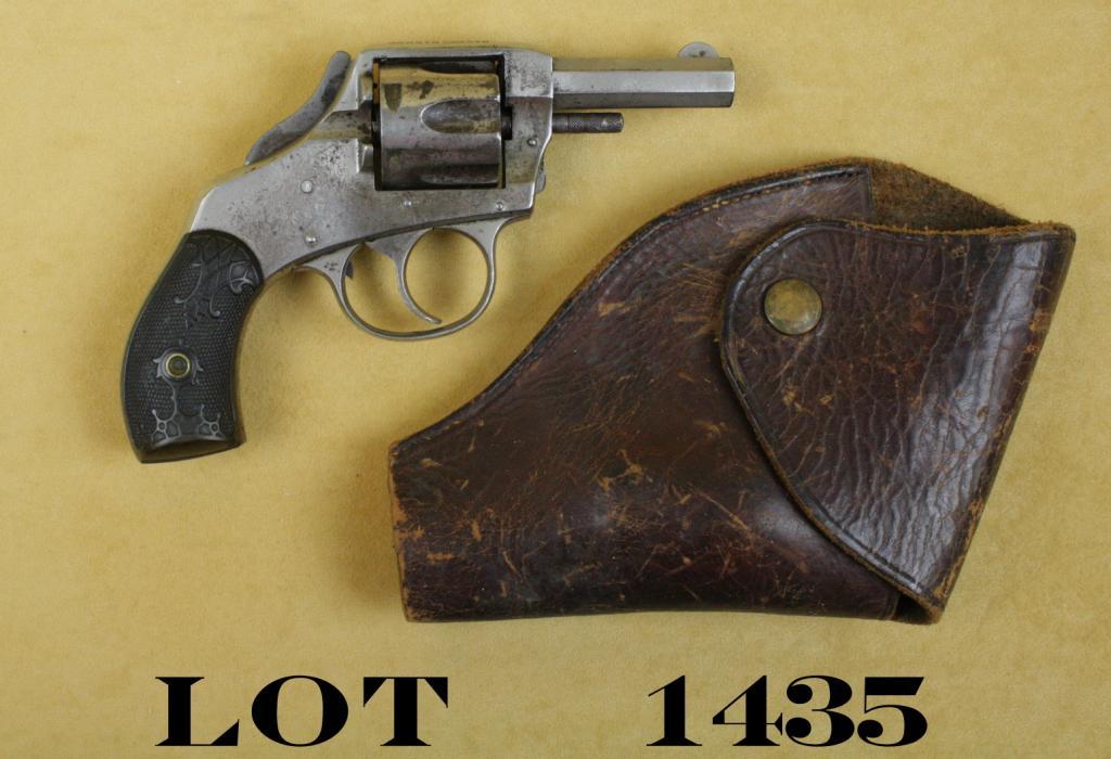 Safety Hammer Model DA revolver, .32 cal., 2-1/2” octagon barrel, nickel finish, checkered black hard rubber grips, #NVSN. This gun is in overall good condition showing approx. 60% original nickel finish, goodmarkings and action, dark bore, overall good grips; accompanied by a cut down unmarked leather flap holster in well-worn condition. Est.: $100-$200.