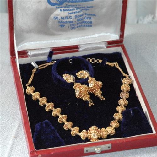 Wonderful necklace & pierced earrings set by Sagar ( Dealers of American Diamond and Modern Imitation Jewellery). The workmanship is exquisite. Made of some spectaluar goldtone metal beads. The smaller beads are double turbinated with wider center of filigree work. The large center bead are globes adorned with mirror glass set in protusion that are surroned by tiny goldtone beaded rings. The earring balls are suspended from a mirror glass teardrop set in a flower head resting atop of leaves. <p> The necklace measures 17 3/8" including the clasp. I would say that the condition is excellent. The beads may not be as bright as they were when new. It comes in what I assume is the velvet lined original box.