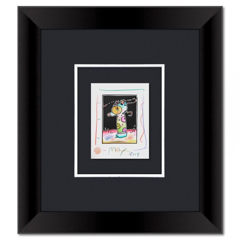"Sage in the Wind" is a one-of-a-kind mixed media on paper, hand signed by Peter Max. The piece comes custom framed with a backside cutout to display Peter Max Studio registration number 339962 certifying authenticity. Measures approximately 23" x 21" (frame), 9" x 7" (image).