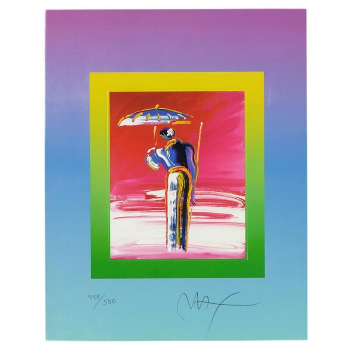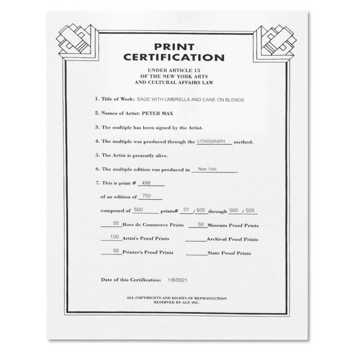 Sage with Umbrella and Cane on Blends by Peter Max. "Sage with Umbrella and Cane on Blends" is a limited edition lithograph on paper by Peter Max, numbered 498/500 and hand signed by the artist. This piece comes framed. Includes Certificate of Authenticity from Peter Max Studios. Measures approximately 21" x 24" (frame), 10" x 13" (image).