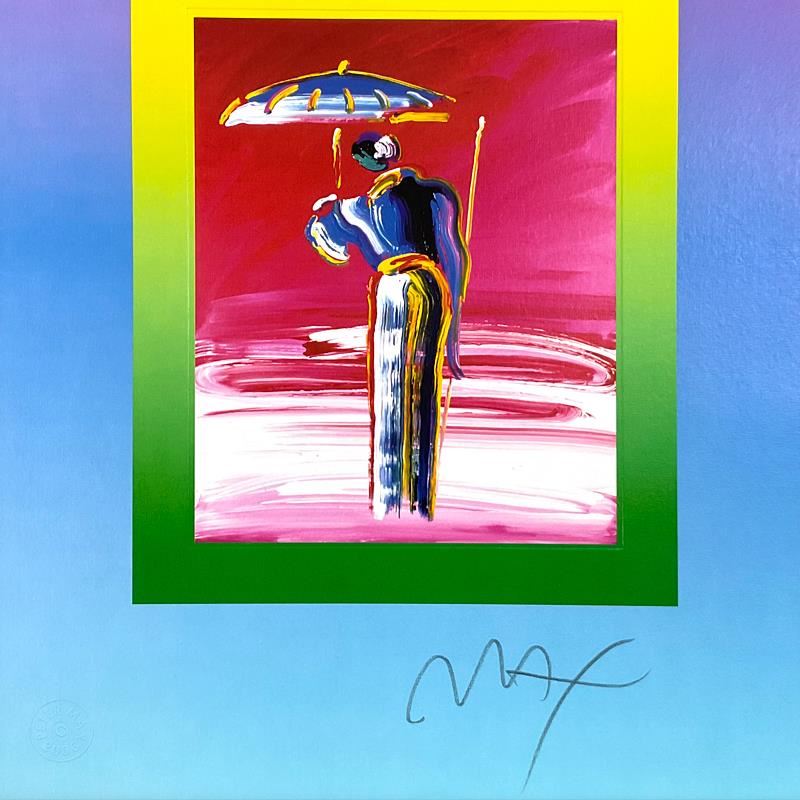 "Sage with Umbrella and Cane on Blends," is a limited edition lithograph on paper by Peter Max, numbered and hand signed by the artist. This piece comes framed. Includes Certificate of Authenticity from Peter Max Studios. Measures approx. 20" x 23" (frame), 13" x 10" (image).