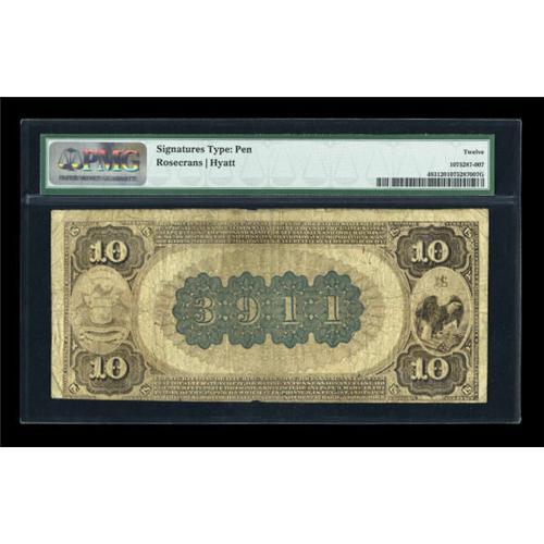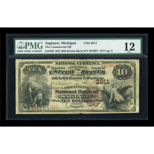 <B>Saginaw, MI</B></I> - $10 1882 Brown Back Fr. 483 <B>The Commercial NB</B></I> Ch. # 3911<BR> This is our first opportunity to offer an example from this scarce Michigan charter to the collecting fraternity. Just a dozen notes are enumerated in the census from this large only institution that closed in 1922. This evenly circulated Brown Back, that has been certified as <B>PMG Fine 12</B></I>, still carries bold pen signatures. A few pinholes have to be mentioned for the sake of accuracy.<BR><BR><b>Shipping:</b> Coins & Currency (<a target="_blank" href="http://www.heritageauctions.com/common/shipping.php">view shipping information</a>)