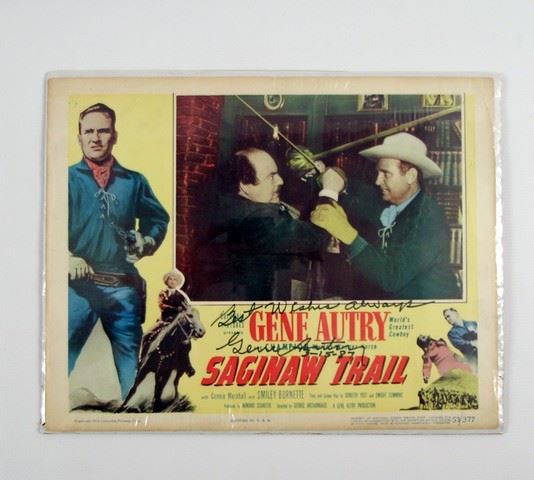 From one of Gene Autry's best Musical-Westerns "Saginaw Trail", comes this original color lobby card. It has been signed by Gene Autry himself, and is specially shrink wrapped to insure it's excellent condition. Saginaw Trail is famous for the final sword fight scene (shown in the Lobby Card) which was actually done by master fencer Ralph Faulkner who was much taller than Gene, and had different color hair! However Gene hated fencing and refused to do the scene although he liked the idea of swashbuckling swordplay in a western which was unique at the time. ! it also is known for his gang to use "Yankee Doodle Dandy" as their "signal", even though the song wasn't written until 1904, and the film takes place in 1875. Lobby card is 14"x11".