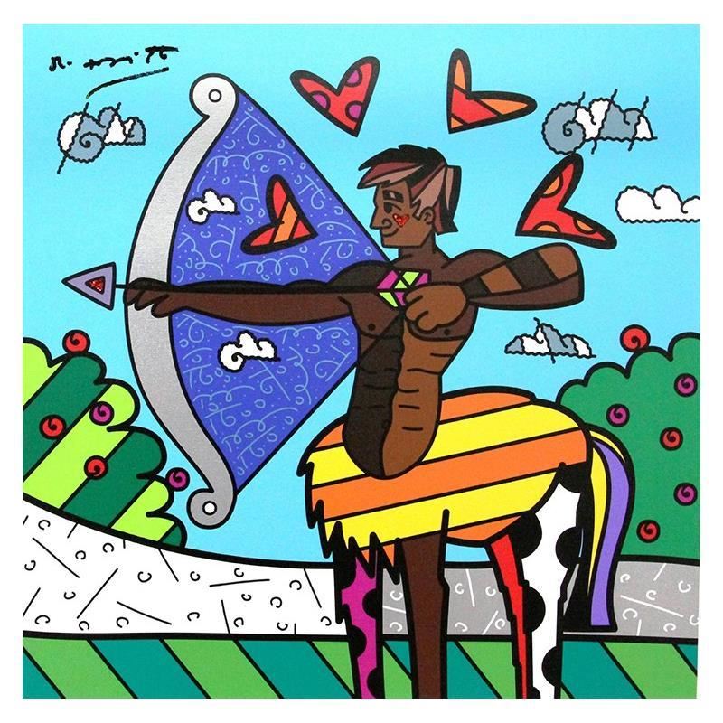 Sagittarius Black by Britto, Romero. "Sagittarius Black" is a limited edition giclee on canvas by Romero Britto. The piece is numbered, hand signed by the artist, and comes with a Certificate of Authenticity. Measures approximately: 11" x 11". This item r
