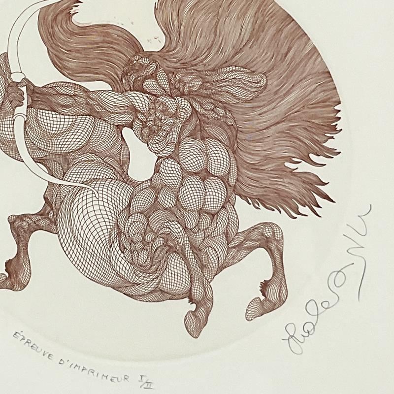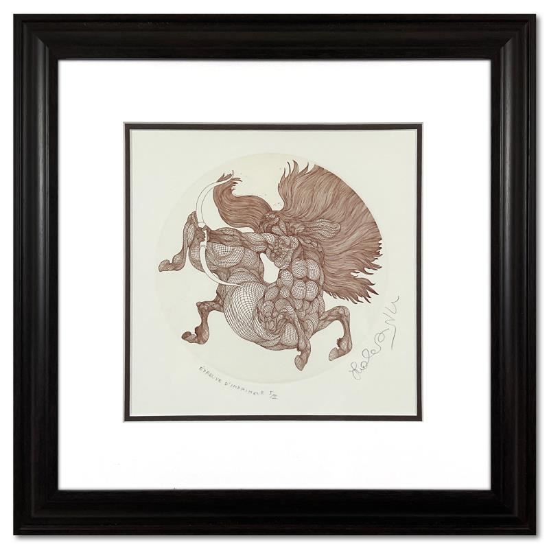"Sagittarius" is a limited edition etching on paper by Guillaume Azoulay, numbered I/II and hand signed by the artist. This piece comes custom framed. Includes Letter of Authenticity. Measures approx. 20.5" x 20.5" (frame), 9" (image-diameter).