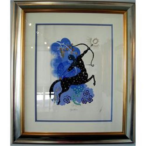This limited edition Lithograph 170/350 is named Sagittarius by the artist Romain de Tirtoff. Pencil Signature Lower Right. Stamped Lower Left. It is within a silver and gold frame with triple matting with white , black, and blue. The fram is 38.5" x 33". The Lithograph is 25" x 19.5". The Zodiac sign of Sagittarius is a fire sign and is from November 22nd through December 21st each year. The bow and arrow symbolizes the fiery personalities of love and passion.