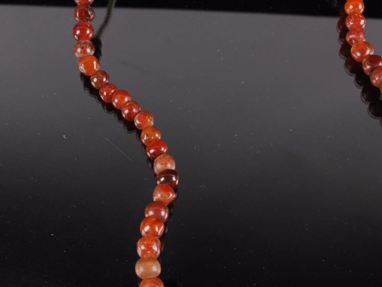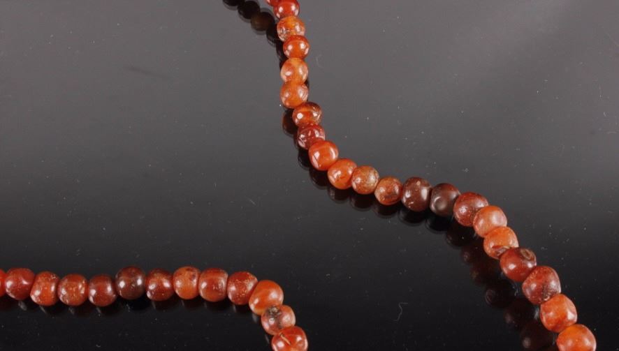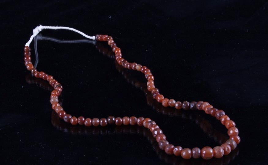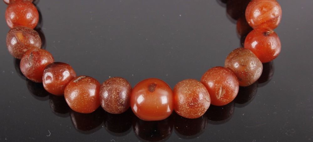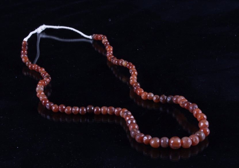 This lot features a necklace beaded with Saharan Lithics and Neolithic beads. The piece was originally discovered in the Morocco/Mauritanaia border region. The beads are thought to be form the later part of the Stone Age, when ground or polished stone weapons and implements prevailed. The condition of the piece is good for its age. Measures: 13 " Diameter