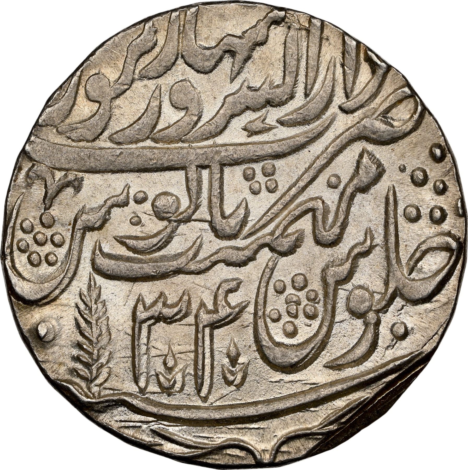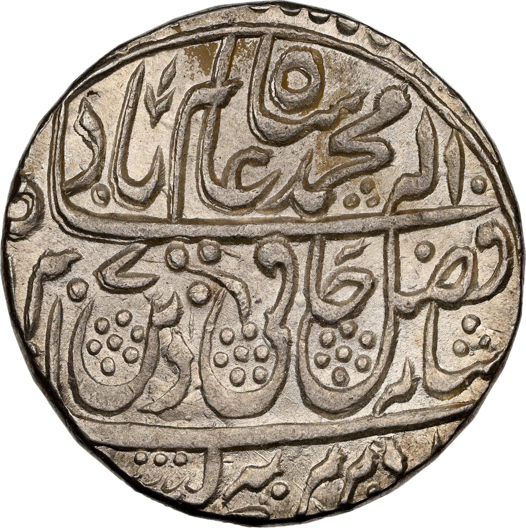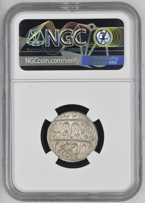 Maratha Confederacy, Saharanpur Dar-ul-Surur Mint, Silver Rupee, AH 1207/34 RY, "Saya-e-fazle Elah" Couplet, In the name of Shah Alam II, Obv: Persian legend "Sikka zad bar haft kishwar Saya-e-fazle Elah, Hami dine Muhammad Shah Alam Badshah", Rev: Persian legend "sana 34 julus" & "zarb Saharanpur" with the epithet "Dar-us-Surur" completely visible at the top, (M&W # T1), graded & slabbed by NGC as MS65, Rare in this grade.