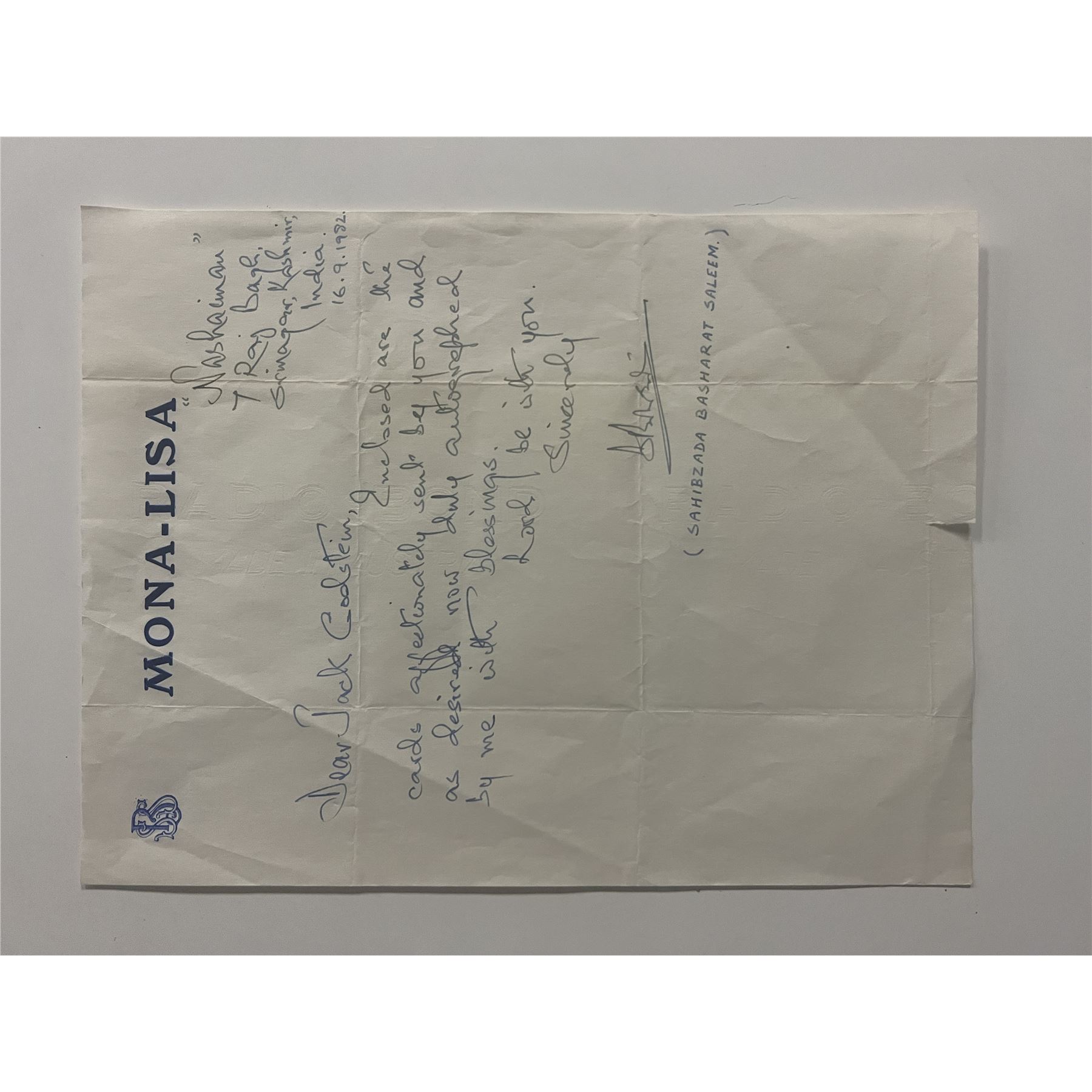Sahibzada Basharat Saleem signed letter. 8x10 inches