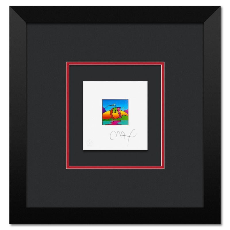 "Sail Profile" is a limited edition lithograph on paper by Peter Max, numbered and hand signed by the artist. This piece comes framed. Includes Certificate of Authenticity from Peter Max Studios. Measures approx. 15" x 14.5" (frame), 5" x 4.5" (image).